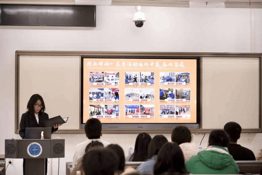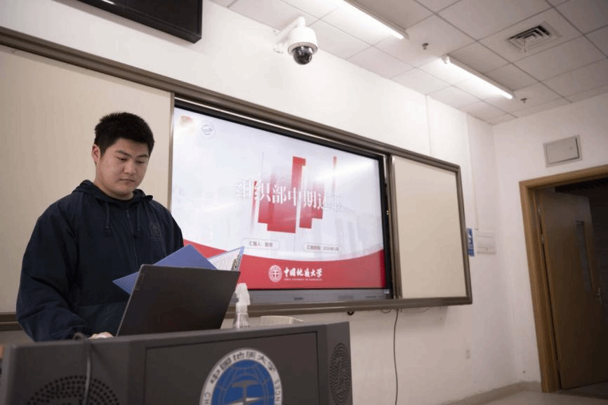 答辩现场,由学生会主席团成员吴汉东主持,组织部、志愿者协会、全媒体中心各工作组、信息调研与权益服务中心、文体部、办公室、科技部、学风部各部门负责人进行依次汇报。