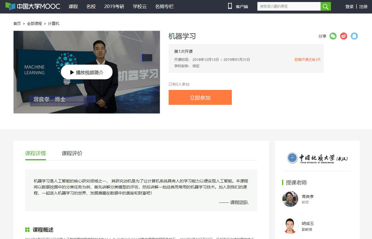 2018年12月13日,中国地质大学(武汉)《机器学习》课程在中国大学MOOC平台正式开课。本课程由计算机学院教授蒋良孝,计算机学院副教授胡成玉主讲,课程内容精心设计,为学生提供了便利的学习平台。本课程将以数据挖掘中的分类任务为例,首先讲解分类模型的评估,进而讲解一批经典而常用的机器学习技术,是高等学校机器学习领域科研人员和对机器学习兴趣浓厚的师生不可或缺的高质量课程。课程链接: