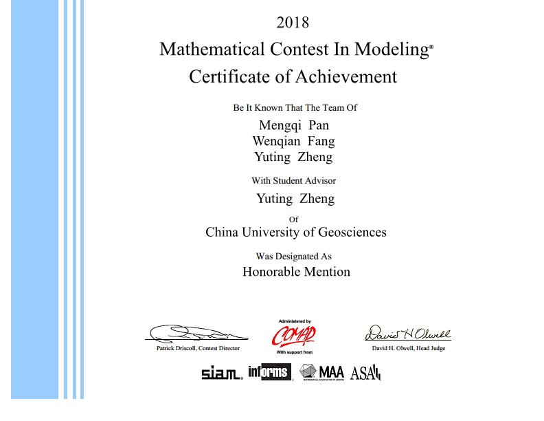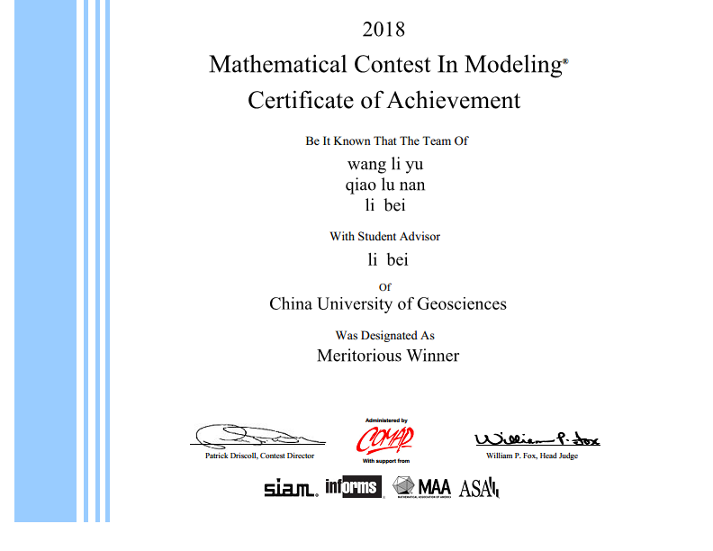 在与众多名校参赛队的激烈角逐中,我校计算机学院三名同学李贝(2016级硕士计算机科学与技术专业)、乔璐楠(2016级硕士计算机科学与技术专业)、王利宇(2017级硕士计算机科学与技术专业)获得了该项赛事一等奖(Meritorious Winner)。另外,计算机学院潘孟琦(2016级硕士计算机科学与技术专业)、数理学院方文倩(2017级硕士信号处理与智能计算)、计算机学院郑雨婷(2017级硕士计算机科学与技术专业)三位同学获该项赛事二等奖(Honorable Mention)。