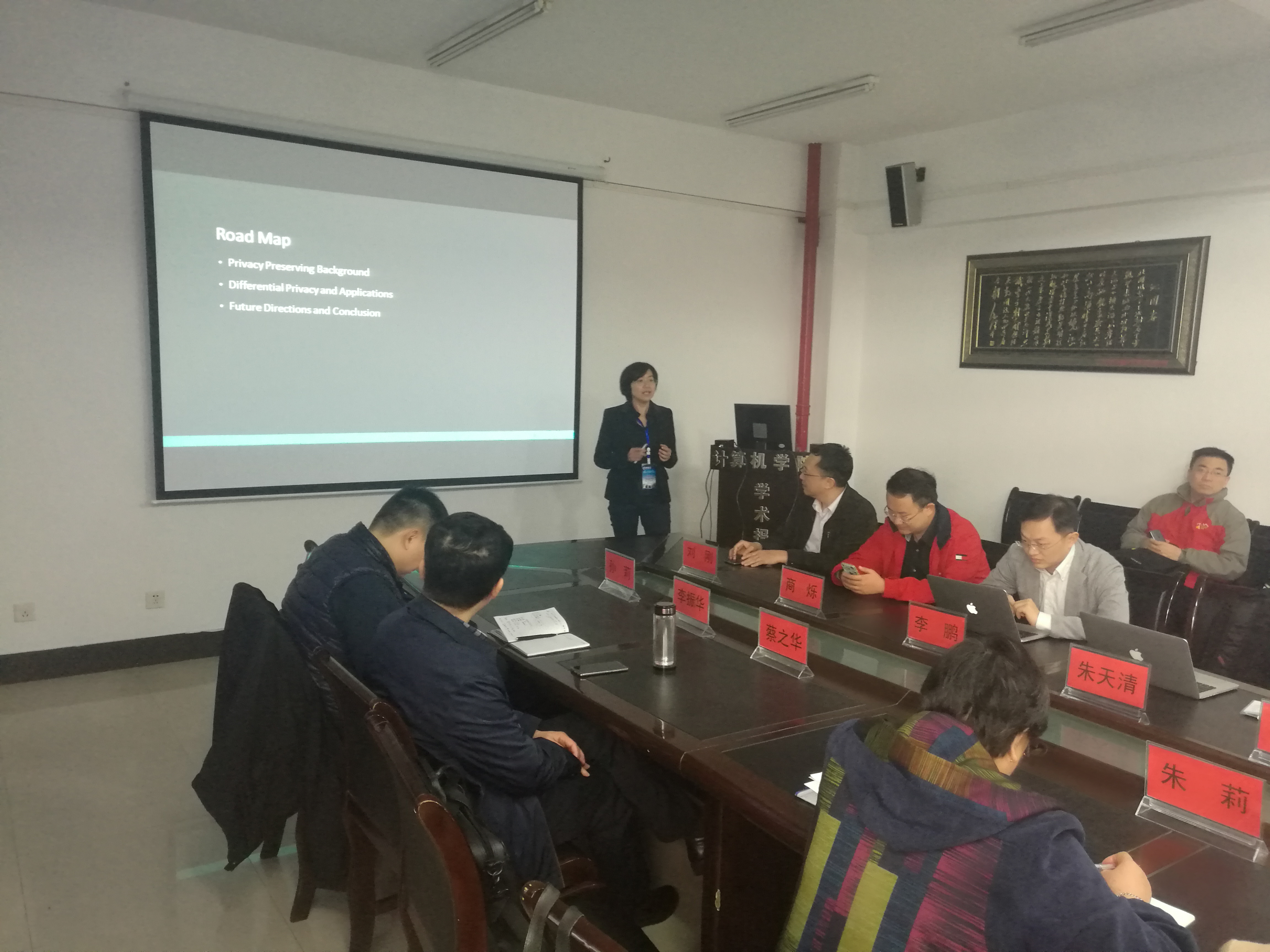 之后各位学者们分别就自己的研究成果进行了报告。来自澳大利亚迪肯大学的朱天清博士做了题为《大数据环境下差分隐私保护的理论基础和应用前景》的学术报告、来自澳大利亚昆士兰大学的武琳博士做了题为《Advancing Deep Learning into Intelligent Surveillance Systems》的学术报告、来自日本会津大学的李鹏博士做了题为《Resilient Computing and Communication Infrastructure for Disaster Management》的学术报告、来自美国匹兹堡大学的郑锋老师做了题为《Research and Application of Fast Algorithm in Large-Scale Multimedia Data》的学术报告、来自沙特阿卜杜拉国王科技大学的商烁做了题为《Trajectory Similarity Join in Spaital Networks》的学术报告。各位老师们聚精会神的听取了各位学者们的报告,随后与学者们进行了深入的沟通交流。