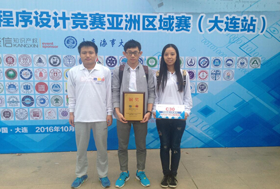 (通讯员:刘佳)日前,从第41届ACM国际大学生程序设计竞赛亚洲区域赛传来喜讯。由我校计算机学院张锋老师指导,来自计算机学院ACM实验班的訚石松、王保诚、郑雨婷同学组成的“鸡蛋西红柿”代表队,以及由陈律昊、张显龙、姬晨烜同学组成的“龙之旅”代表队获得铜奖。
