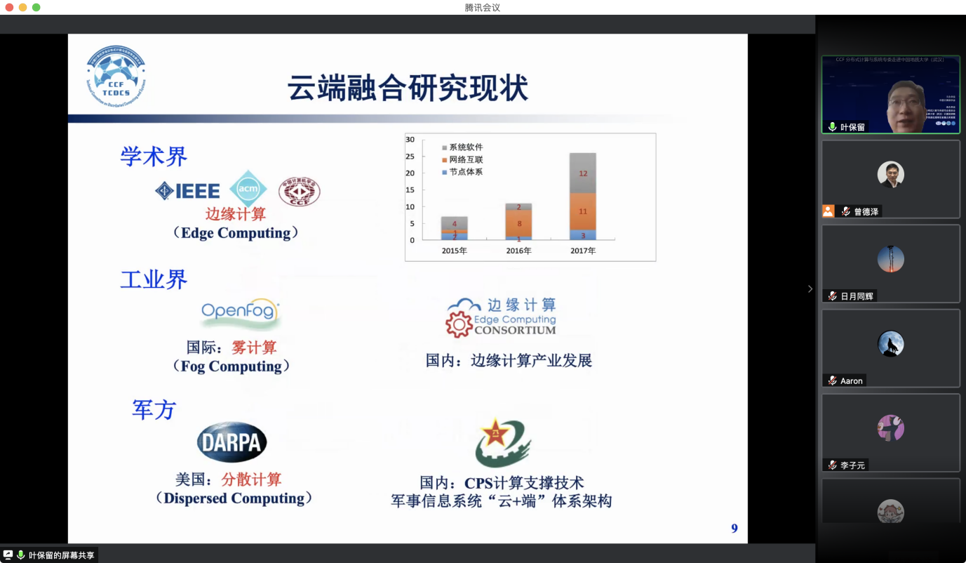 叶保留教授的报告题目为《从“云端融合”到“云-边-端融合”:边缘计算机遇与挑战》。叶教授认为,云边端融合是应对智能终端设备的泛在普及导致网络边缘设备产生的数据急剧增加的潜在有效途径。叶教授讨论了如何引入软件定义概念,实现云边端资源的动态协同与高效融合,提出了基于微服务架构的云边端服务协同。结合边缘计算理念及云边端融合目标,叶教授从体系架构设计、资源优化模型、服务协同方法等多个角度总结了相关技术研究进展,分析了云边端融合所面临的核心挑战,并探讨了未来的发展趋势。