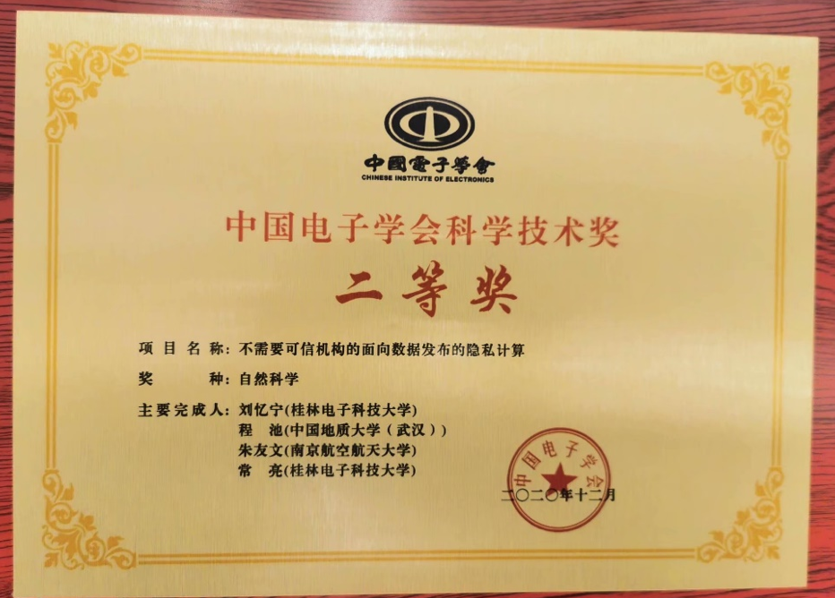 (通讯员:章丽平)2021年4月17-18日,中国电子学会2020年度科学技术奖励大会在重庆举行。计算机学院信息安全系程池老师与桂林电子科技大学、南京航空航天大学的学者共同完成的“不需要可信机构的面向数据发布的隐私计算”荣获2020年度中国电子学会科学技术奖自然科学二等奖。郝跃院士、刘明院士等23位院士出席大会并颁奖。