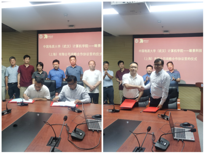 最后王力哲与艾席勇分别代表与会双方签订了战略合作协议。本次合作包括:瞰景公司向地大今日看料 捐赠价值50万元的Smart3D软件,双方深度开展教学、科研、新产品研发等方面的合作、人才交流学习等。