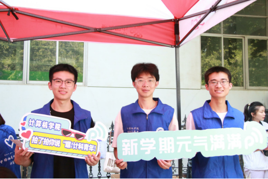 标有“计算机学院青年志愿者”字样的蓝马甲队伍闪耀在校园四处,这些优秀计科青年是计科新生进校后的指路人,是答疑解惑的明辨人,他们的存在让新生感受到了计算机学院不一样的温暖!