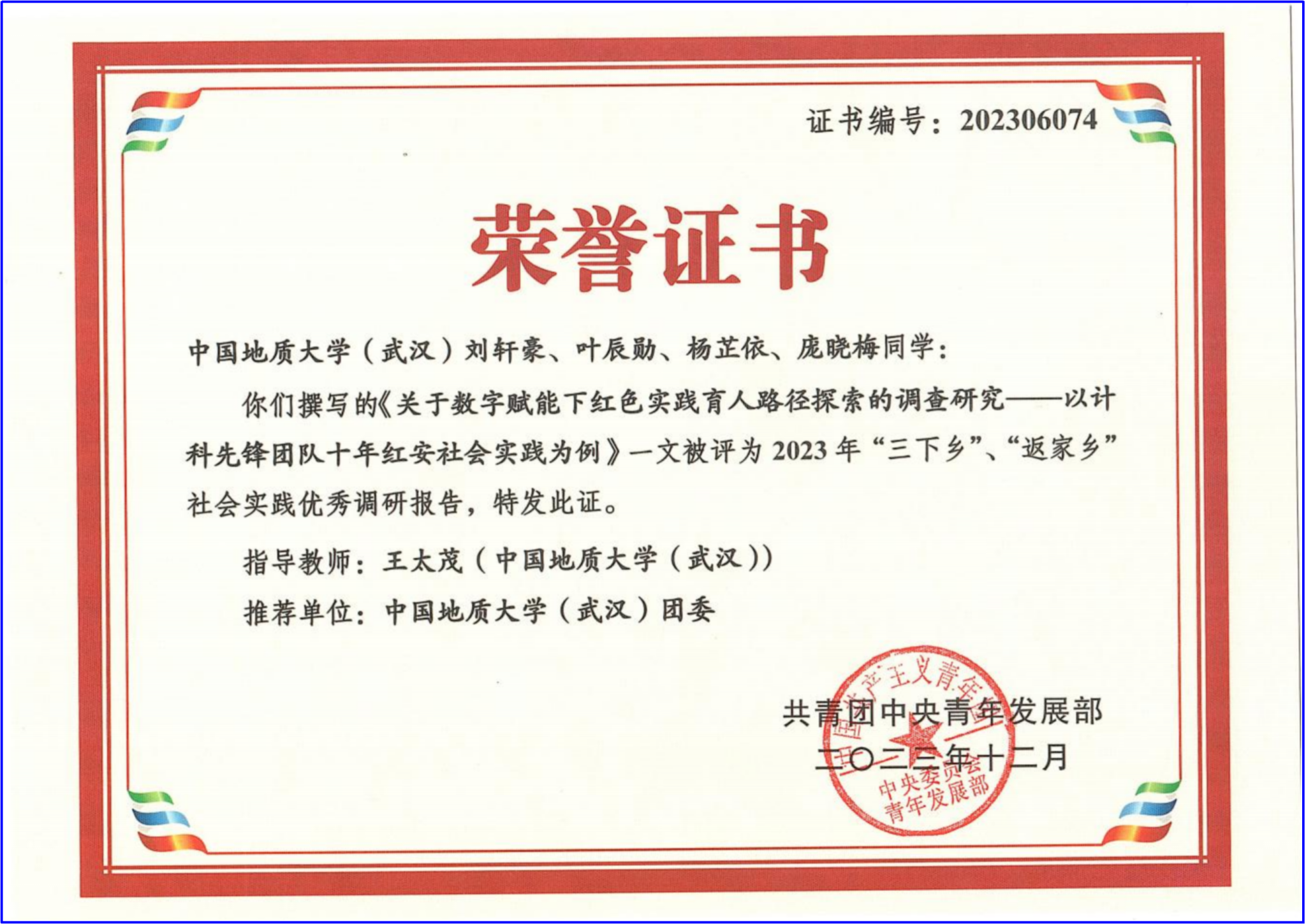 近日,共青团中央青年发展部公布2023年度“三下乡”、“返家乡”社会实践优秀调研报告拟入围名单。在我院王太茂老师指导下,刘轩豪、叶辰勋、杨芷依、庞晓梅同学的实践调研报告《关于数字赋能下红色实践育人路径探索的调查研究——以计科先锋团队十年红安实践为例》成功入围。