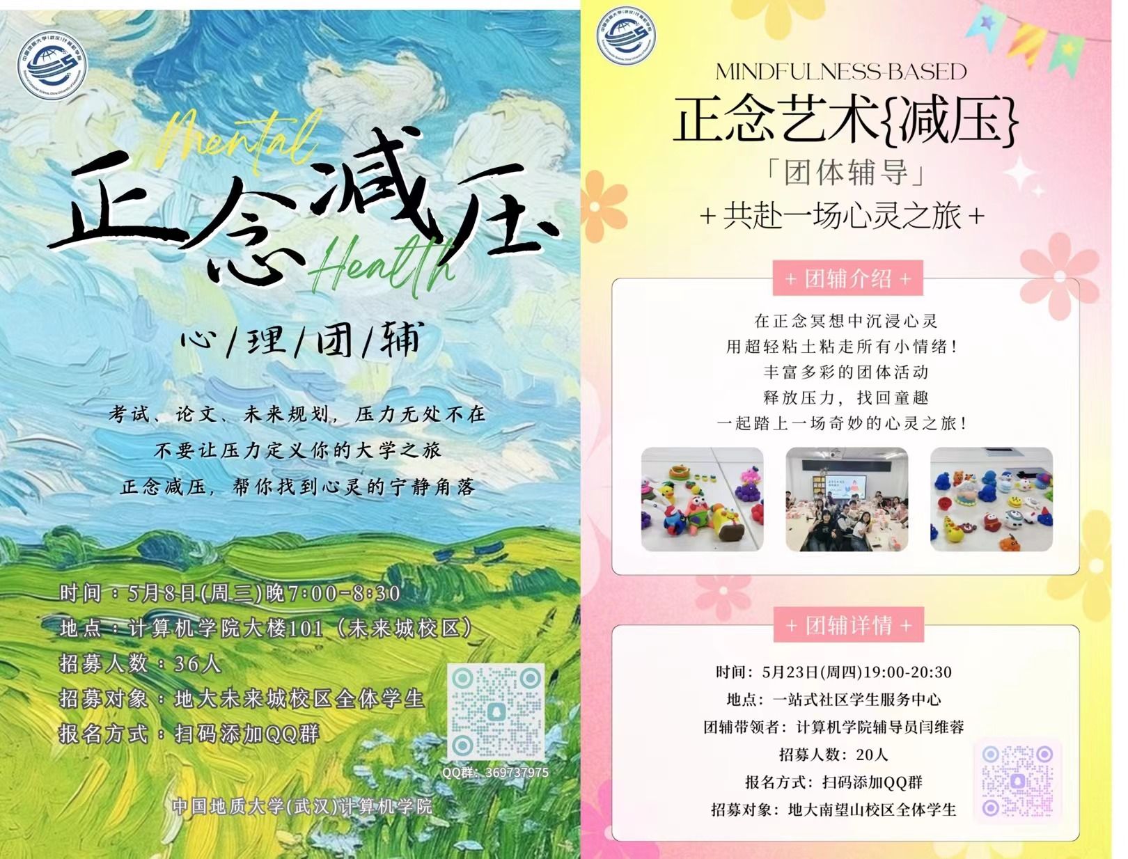 5月8日、5月23日晚上,学院心理健康辅导员闫维蓉分别在未来城和南望山校区开展了两场正念艺术减压团体辅导活动,通过团辅,同学们不仅学习到了正念的基本理念和实践技巧,更在粘土减压活动中缓解了工作学习中的压力与负面情绪。