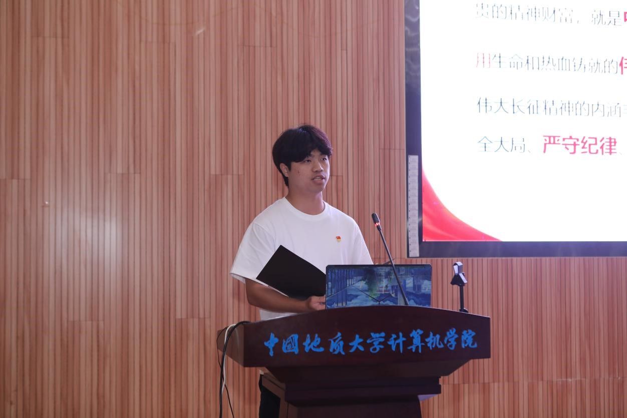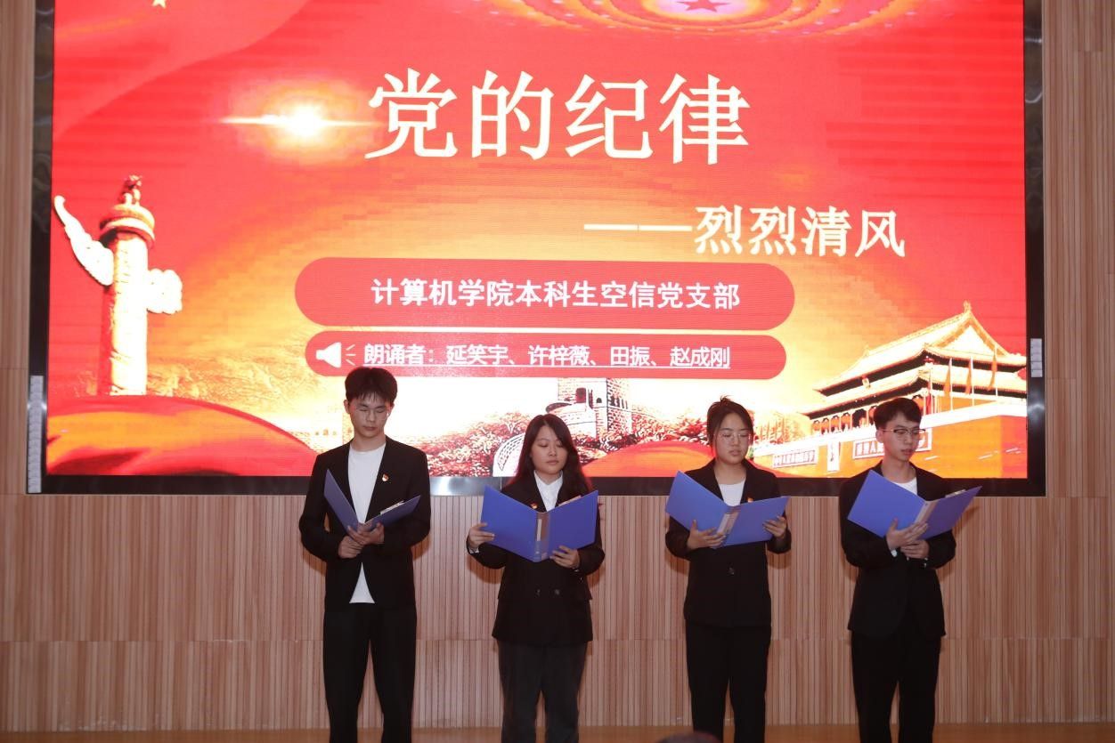 活动在雄壮的国歌声中拉开帷幕。学生党支部书记率先登场。电子信息第三党支部朱国强以刘邓大军的严明军纪为例,强调了纪律在军队建设中的重要作用。本科生信安党支部郭鹏顺则从新民主主义革命时期的党纪建设出发,强调了坚守初心、严明纪律的意义。本科生空信党支部延笑宇等多名成员以“党的纪律:烈烈清风”为题的诗歌朗诵,声情并茂地展现出对党廉政建设的歌颂。本科生计科第一党支部王诗敏则以延安廉政的故事为蓝本,深入剖析了党在推动廉政反腐方面的必要性和坚定决心。电子信息第二党支部潘灿通过讲述郭明义的故事,展现了廉洁奉公、无私奉献的崇高精神。电子信息第一党支部胡长浩深刻阐述了铁纪在长征这一伟大的历史事件中的关键作用。在计算机学院空间信息工程党支部与经济管理学院生态文明研究生样板党支部成员的精心编排下,以一场独具特色的话剧将现场气氛推向了高潮,生动诠释了“亲民爱民、艰苦奋斗、科学求实、迎难而上、无私奉献”的“焦裕禄精神”。