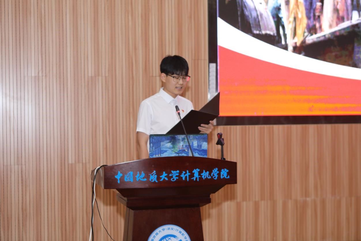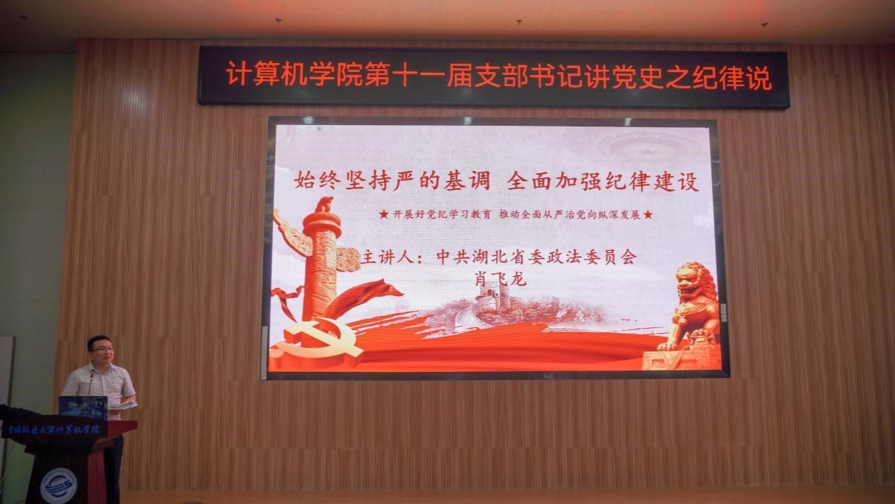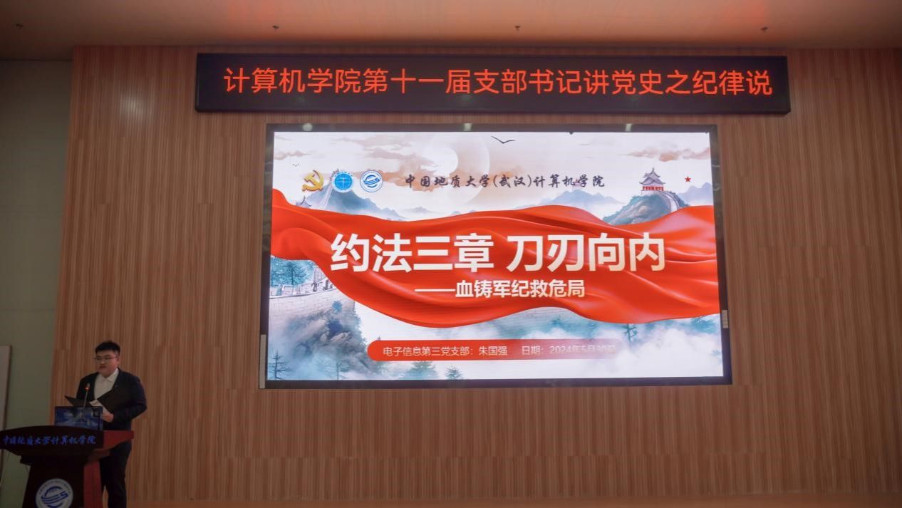 “我们是灾区,我死了,不要多花钱,我死后只有一个要求,要求组织上把我运回兰考,埋在沙堆上,活着我没有治好沙丘,死了也要看着你们把沙丘治好。”......舞台上,计算机学院空间信息工程党支部和经济管理学院生态文明研究生党支部的党员代表们生动演绎着《焦裕禄》,他们以一场独具特色的话剧将现场气氛推向了高潮,生动诠释了“亲民爱民、艰苦奋斗、科学求实、迎难而上、无私奉献”的“焦裕禄精神”。5月30日下午,计算机学院在学院126报告厅举办第十一届支部书记讲党史之纪律说暨党员骨干集中培训活动。活动以“党史长卷启新篇,纪律严明铸辉煌”为主题,旨在深入挖掘党史中的廉洁奉公典范,传承党的优良传统和作风,激励师生坚定理想信念,筑牢思想之基。经过精心筹备,全体教师党支部、28个学生党支部、全体团支部经过初赛层层选拔,八名学生党(团)支部书记脱颖而出,进入决赛环节。同时,获奖的教师党支部书记代表马钊老师、校友代表肖飞龙以及计算机学院党委书记李国昌讲授了精彩的示范党课。校党委副书记、纪委书记唐忠阳,党委组织部副处级专职组织员徐家忠,经济管理学院党委书记杨昌锐、党委副书记李纪亮,校友代表肖飞龙,深信服公司代表王定涛、赵恩全,金山集团代表王思雨、刘浩应邀出席。计算机学院党委书记李国昌、党委副书记林小艳、辅导员谭文博和进入复赛的学生党、团支部代表现场观摩。学生党建办公室叶岭岚担任活动主持。
