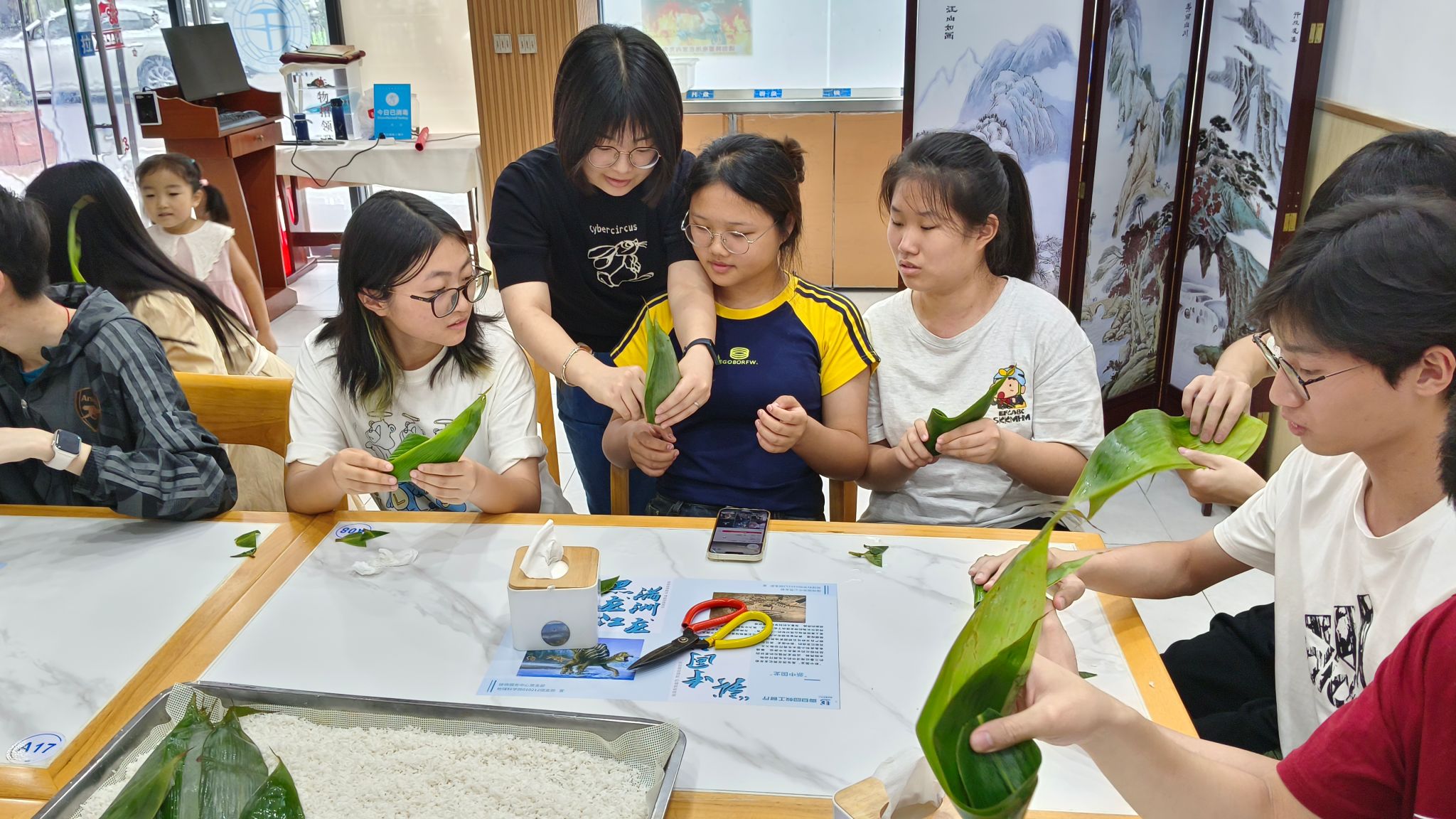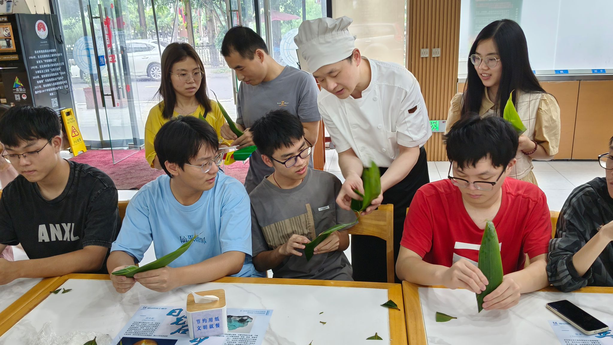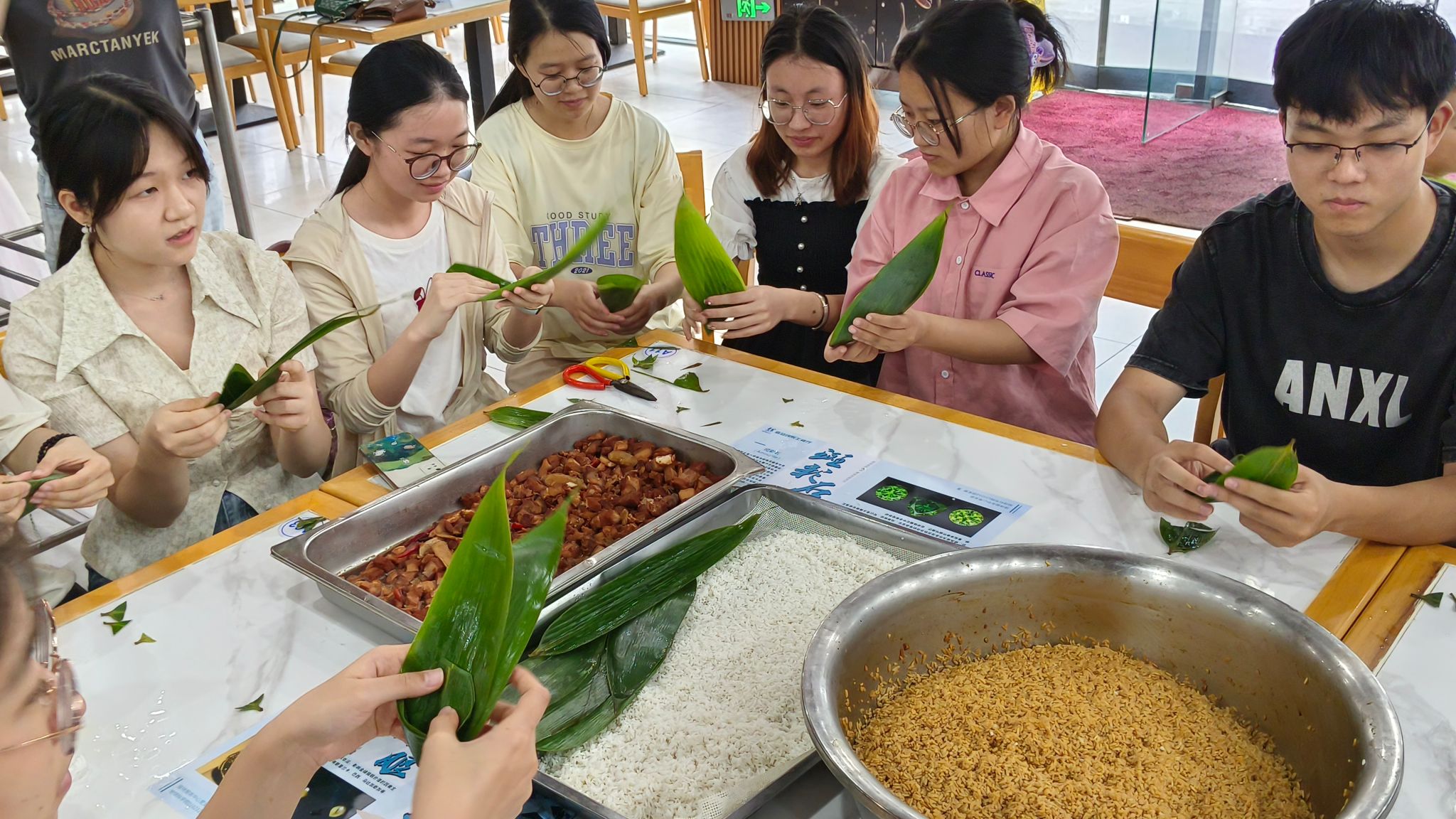 随后,徐大厨为老师同学们详细介绍了包粽子的流程。从粽叶的对齐、折叠,到两次添米,再到封口、用细线绑紧,徐大厨将自己的技能和经验倾囊相授。包粽子过程中同学们积极交流、相互帮助,交流彼此劳动的心得,现场其乐融融。