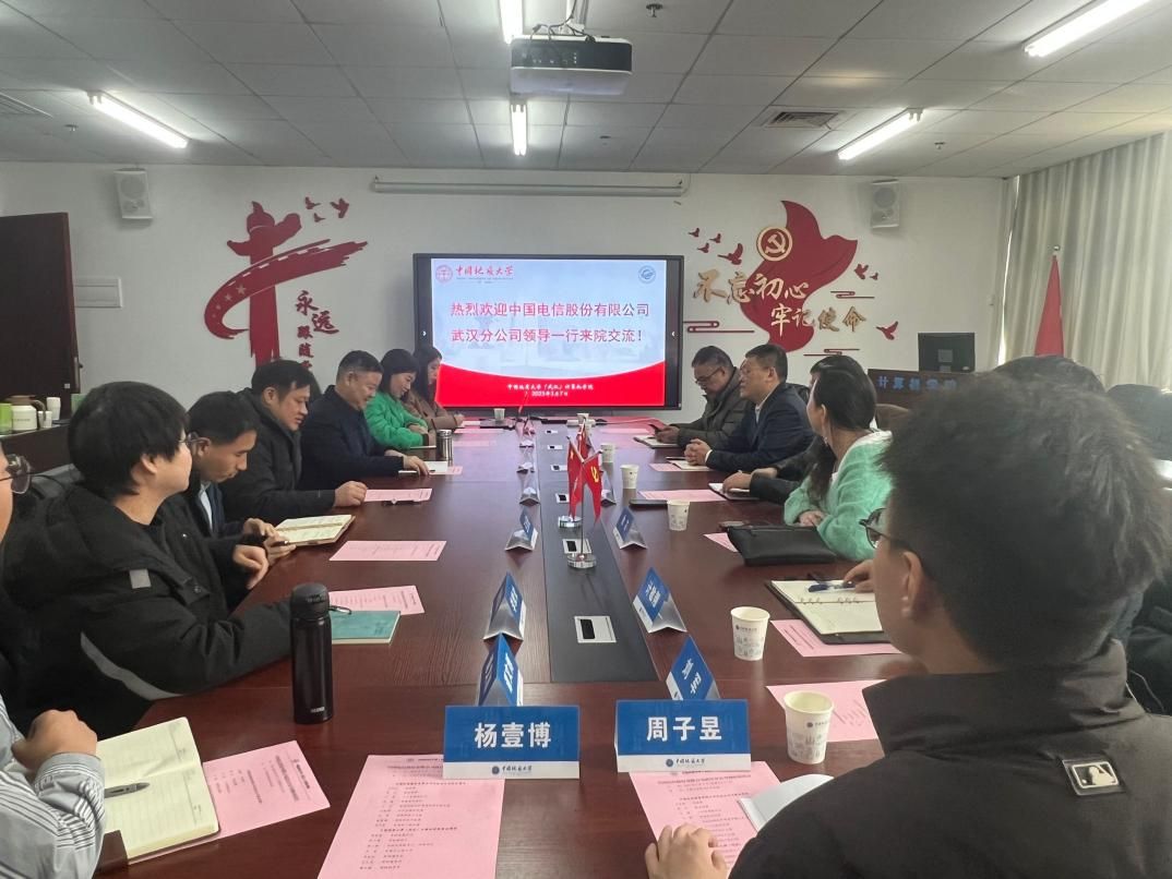 3月7日上午,中国电信股份有限公司武汉分公司来院调研座谈。双方在学院309会议室就校企合作、学生实习、就业等方面进行了深入交流。中国电信武汉分公司总经理代宏斌、副总经理覃兵、人力资源部主任石涛、校园部总经理吴峰等领导,计算机学院党委书记李国昌、副院长陈云亮、党委副书记林小艳等学院领导及辅导员代表参加会议。李国昌主持会议。