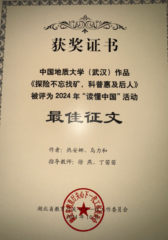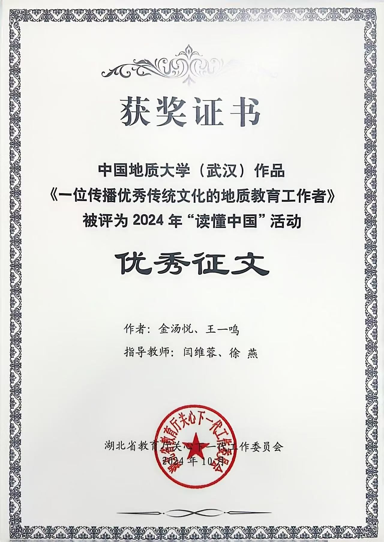 在征文赛道,由我院热安娜、乌力和同学参与撰写的《探险不忘找矿,科普惠及后人》,以深邃的视角记述了费宣校友这位脚下是山河湖海、心中有星辰和梦想的地质人,获评湖北省2024年“读懂中国”活动最佳征文。由我院闫维蓉、图书档案与文博部徐燕老师指导,金汤悦、王一鸣同学撰写的《一位传播优秀传统文化的地质教育工作者》以细腻的笔触勾勒出曾佐勋教授40余年教书育人、传播中华传统文化的动人故事,获评湖北省2024年“读懂中国”活动优秀征文。