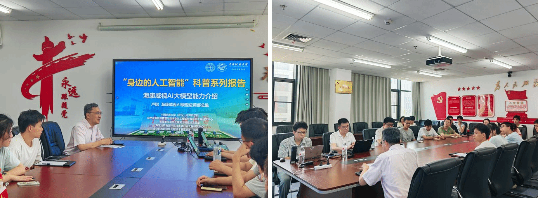 为了让学院师生们进一步了解人工智能大模型前沿进展,推动相关领域的知识传播与交流,2025年7月7日下午,计算机学院在计科楼309会议室举行“身边的人工智能”科普系列报告(第一期)活动,特别邀请海康威视 AI 模型应用部总监卢聪,以“海康威视 AI 大模型能力介绍”为主题做专题报告。学院副院长刘刚教授主持活动,30余名研究生参与本次活动。
