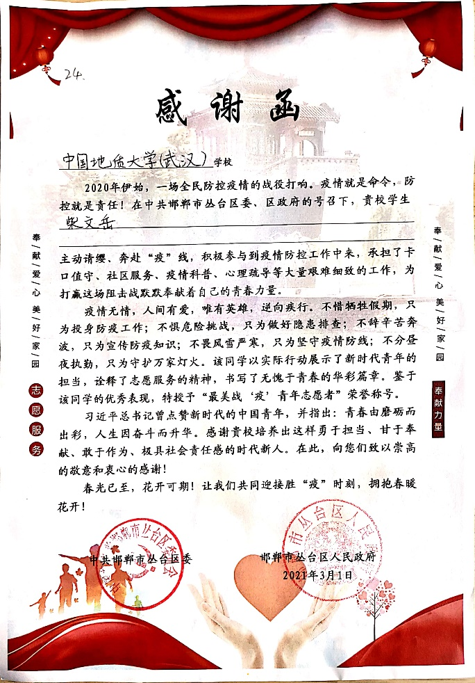 (通讯员:陈宝华)“疫情就是命令,防控就是责任!在中共邯郸市丛台区委、区政府的号召下,贵校学生柴文岳主动请缨,奔赴‘疫’线,积极参与到疫情防控工作中来,承担了卡口值守、社区服务、疫情科普、心理疏导等大量艰难细致的工作,为打赢这场阻击战默默奉献着自己的青春力量……”近日,中国地质大学(武汉)收到一封中共邯郸市丛台区委、邯郸市丛台区人民政府发来的感谢函,对计算机学院191191班柴文岳同学在疫情防控期间的志愿服务表示感谢,授予他“最美战‘疫’青年志愿者”荣誉称号。