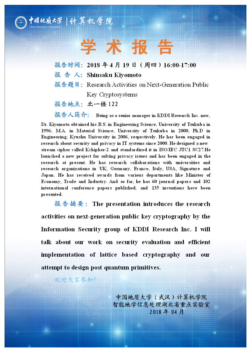 学术报告—Shinsaku Kiyomoto(日本):Research Activities on Next-Generation Public Key Cryptosystems