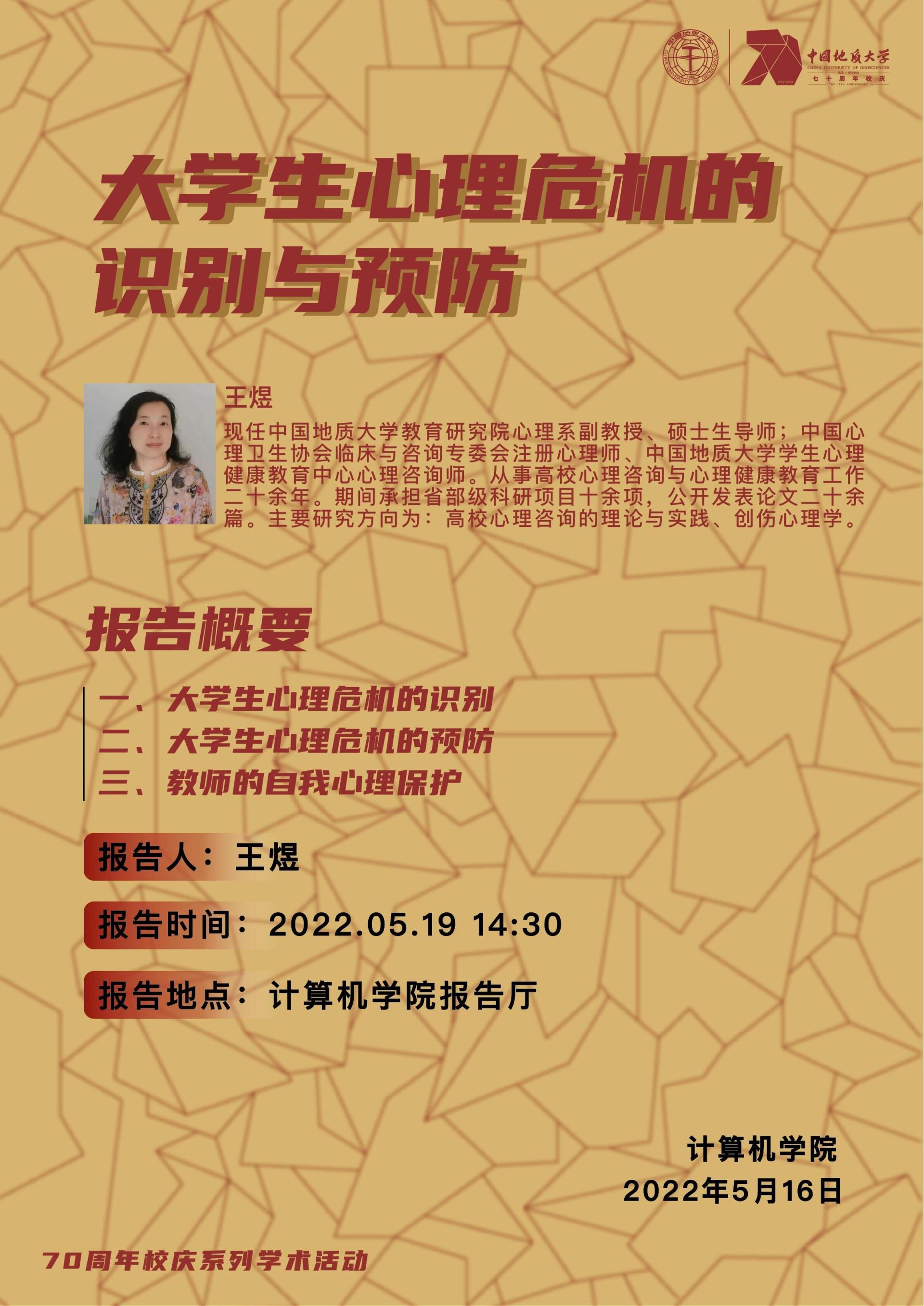 学术讲座——中国地质大学教育研究院心理系副教授王煜:大学生心理危机的识别与预防