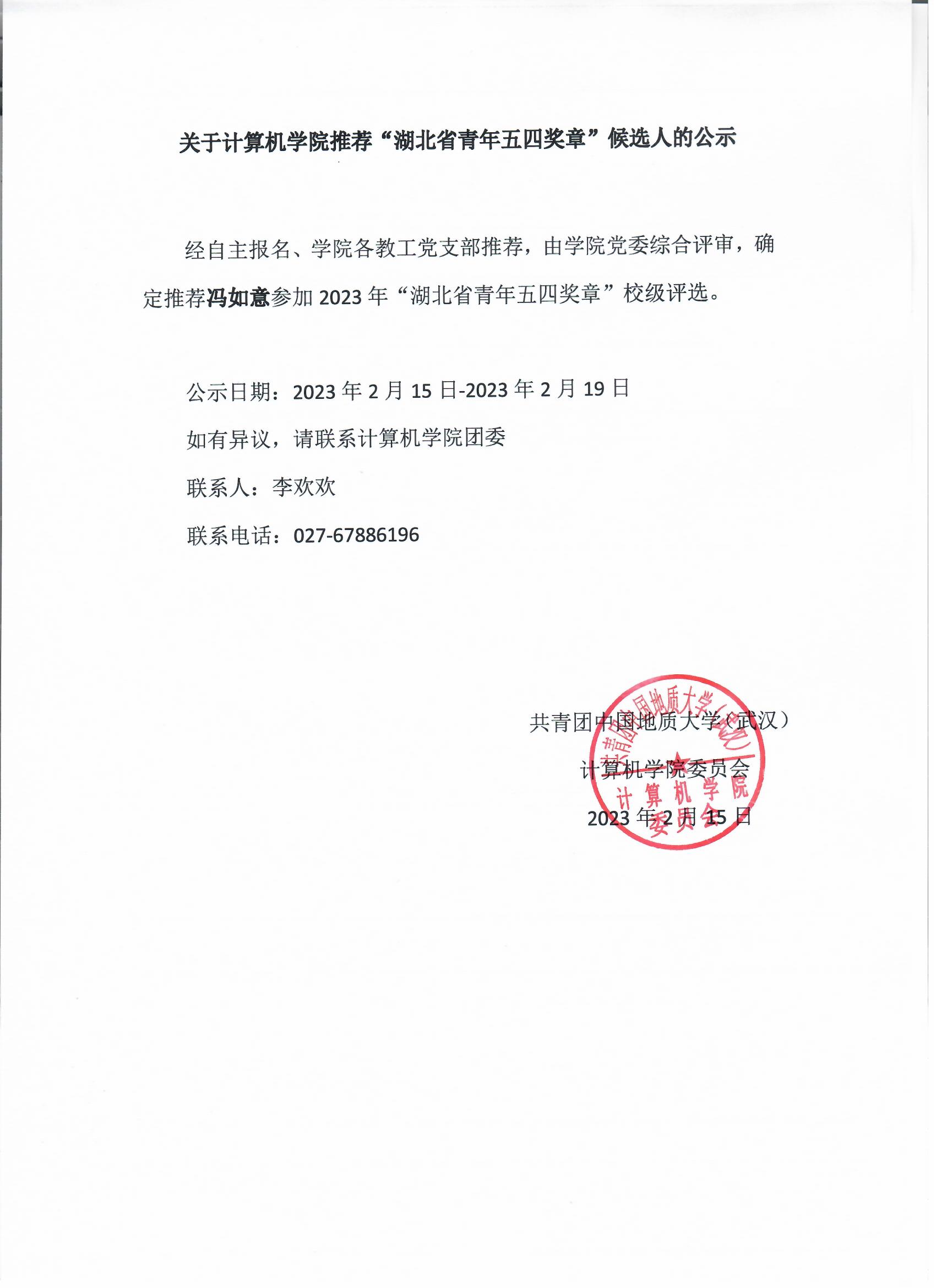 关于计算机学院推荐“湖北省青年五四奖章”候选人的公示