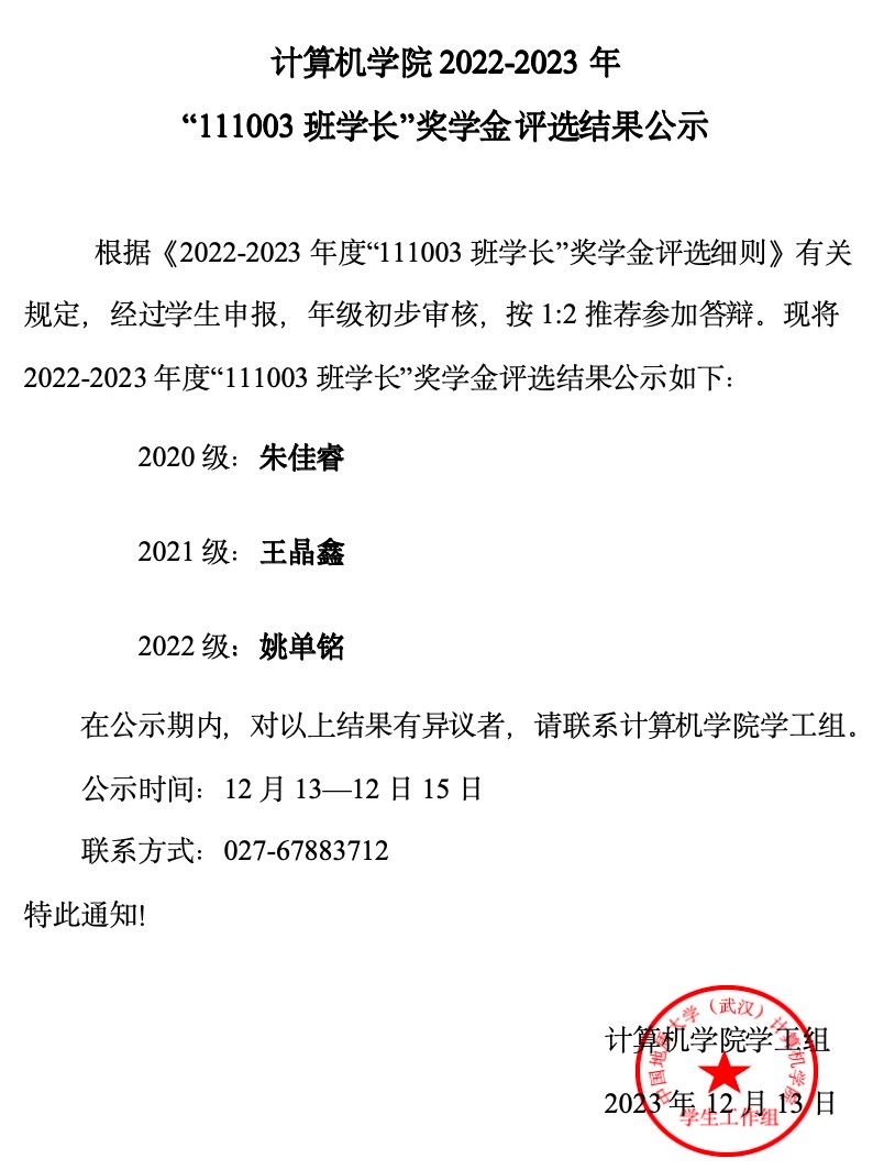 计算机学院2022-2023年 “111003班学长”奖学金评选结果公示