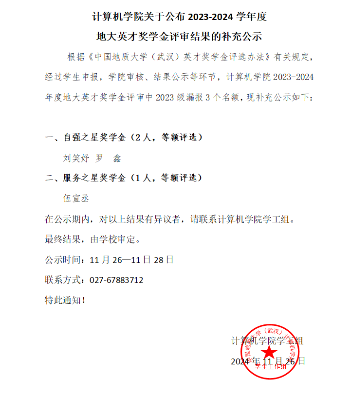 计算机学院关于公布 2023-2024 学年度地大英才奖学金评审结果的补充公示