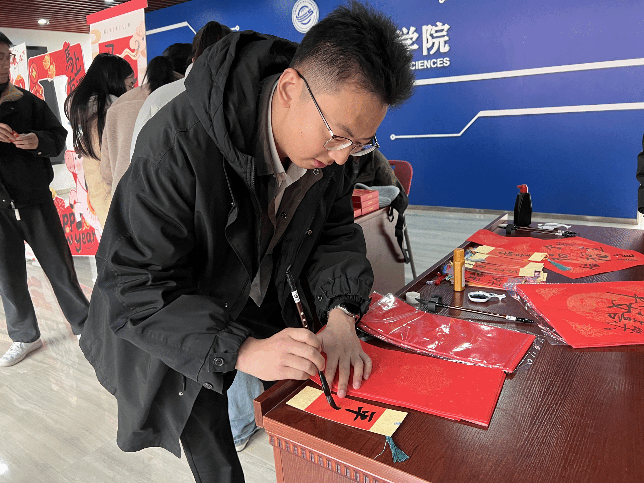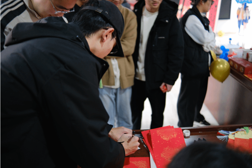 案几铺展红纸,笔墨早已备好,书法达人谭文博老师现场挥毫,笔走龙蛇间,兼具力量与美感的字迹跃然纸上。“代码无bug,科研步步高”“算力赋能,梦想启航”……同学们纷纷围聚,或求取专属定制的新春墨宝,或亲手执笔体验书写之趣。笔尖与纸面的摩挲声中,传统书法艺术的魅力悄然流淌,更将计科人的专业追求与新年期许巧妙融合,每一笔都饱含对新一年的热忱祈愿。