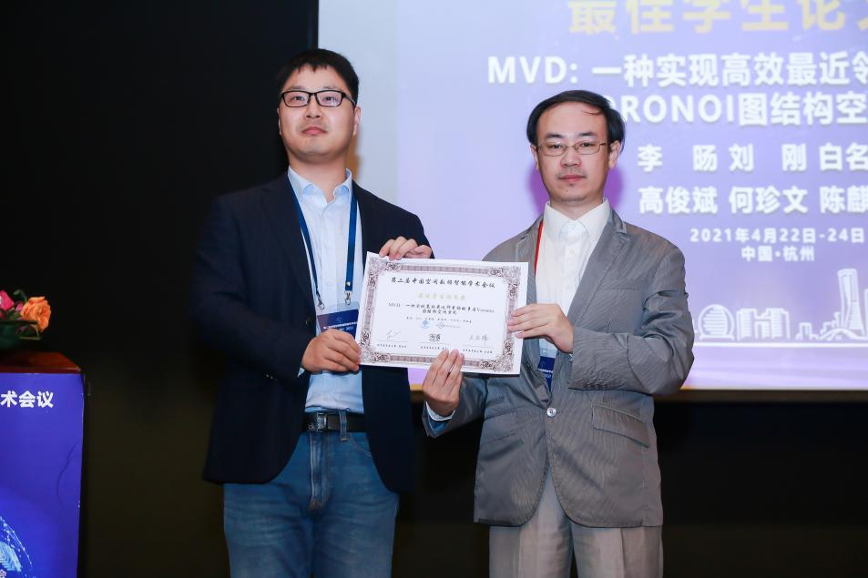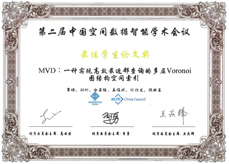 2021年4月24日,为期两天的第二届中国空间数据智能学术会议(SpatialDI 2021)在杭州市浙江宾馆圆满闭幕。以我院博士研究生李旸为第一作者,以刘刚教授为通讯作者的论文《MVD:一种实现高效最近邻查询的多层Voronoi图结构空间索引》荣获会议最佳学生论文奖。该论文针对传统树形索引主要存在的结构失衡和节点重叠问题,提出了一种基于多层Voronoi图结构的空间索引方法,提升了大规模空间数据环境下最近邻查询和k近邻查询的检索效率和I/O性能。