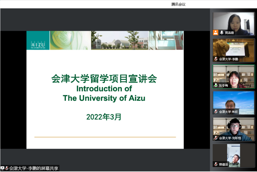 (通讯员:张园园)2022年3月8日晚上,日本会津大学留学项目宣讲线上会议顺利召开。日本会津大学老师李鹏、朱欣、吕国伟,会津大学在读学生陈发浩、傅孛骞、刘昕恺,计算机学院副院长张冬梅、计算机科学与技术系系主任曾德泽、国际合作办公室事务秘书张园园参加会议。宣讲会由国际合作办公室主任黄燕霞主持。