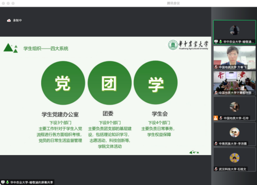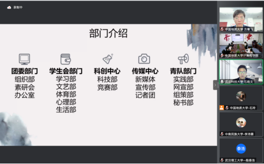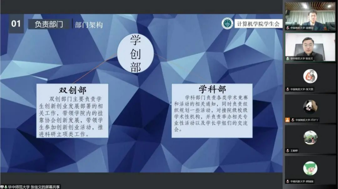 学生会工作会场中,与会代表依次介绍学生组织架构与特色活动开展。分别围绕如何进一步深化学联改革,如何进一步丰富计算机专业青年学生思想引领活动开展和常态化疫情防控背景下校园文化建设思考三个议题深入交流、研讨。中南财经政法大学信息与安全工程学院将团委、学生会各部门按工作职能分为三大类,各司其职、互相协作,促进资源整合,发挥更大合力。华中农业大学信息学院学生会开辟校内社区志愿服务新场域,面向华农附小三年级学生,开展少儿编程志愿服务活动,定期进行编程逻辑指导教学,增强青年学生专业实践能力,切实服务学院师生需要;中国地质大质(武汉)计算机学院学生会主席团成员霍奥林介绍学院结合常态化疫情防控要求,打造“阳光计科人,运动成长季”特色活动体系,通过开展校园趣味定向跑、益智桌游、电竞赛事、文体活动、集体观影等丰富多彩的活动,引领广大青年乐享校园、阳光向上;中南财经政法大学信息与安全工程学院代表卫思涵谈到,学校享有唱歌跳舞大学的称号与学校举办的各项活动密切相关,包括校园舞蹈大赛、合唱晚会、集结号专场表演、歌友会、随机舞蹈、奥运选手现场指导等活动。研讨会现场,各代表踊跃分享工作实践过程中的收获与体会,分析、研讨新时代语境下学联工作改革创新发展的机遇和挑战。中国地质大学(武汉)计算机学院学生会主席团成员霍奥林做会议总结。