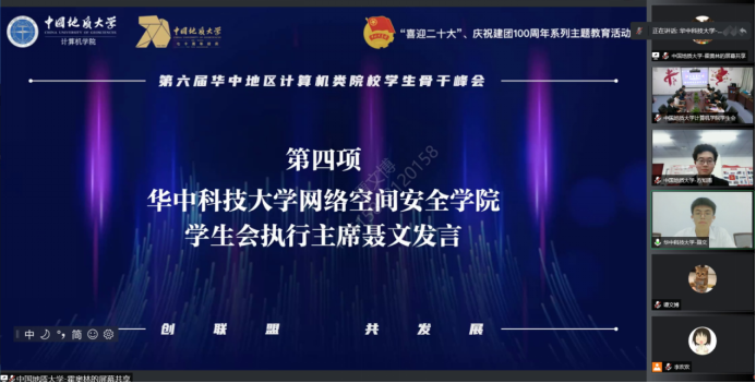 华中科技大学网络空间安全学院学生会执行主席聂文代表所有参会高校对中国地质大学计算机学院领导老师的关心支持以及计算机学院学生会充分的前期准备表示感谢。期待峰会深入推动多维合作,各学生会精诚协作,惠及更多高校和学生。