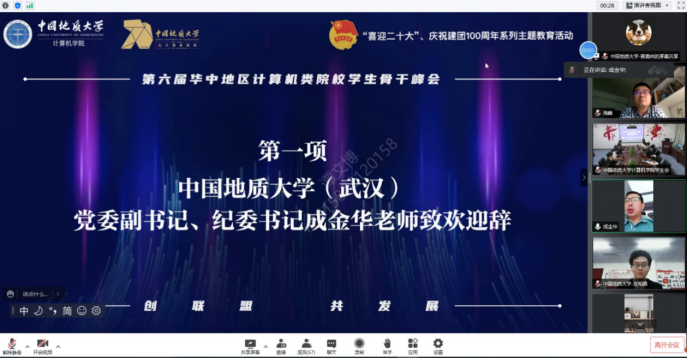 中国地质大学(武汉)党委副书记、纪委书记成金华致欢迎辞,他首先代表中国地质大学向所有参会代表表示热烈欢迎,希望各学生会依托联盟峰会,立足计算机专业特色,着眼行业未来发展,加强深度合作,共谋共议新工科建设发展,互学互鉴宝贵工作经验,不断加强互融互促,共同开创华中地区计算机类院校发展新格局。带领广大青年学生将个人成长发展凝聚成中华民族伟大复兴的磅礴力量,在青春赛道上跑出当代青年的最好成绩!