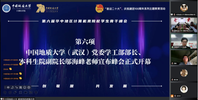 中国地质大学(武汉)计算机学院于2015年牵头成立华中地区首个计算机类院校学生组织发展联盟。联盟以“创联盟·共发展”为理念,定期举行华中地区计算机类院校学生骨干峰会,通过建立长期有效的交流、研讨机制,促进共同发展。第六届峰会以“青春心向党 共‘计’新时代”为主题,分设学生会工作研讨和双创工作研讨两个会场。