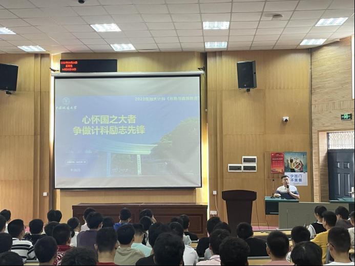 为深入学习贯彻党的二十大精神,使学生了解国内外形势,把握信息学科发展态势,增强学生使命感与自信心,9月8日,计算机学院党委书记李国昌以“心怀国之大者,争做计科励志先锋”为主题给2023级新生讲授形势与政策教育课,2023级全体学生参加。