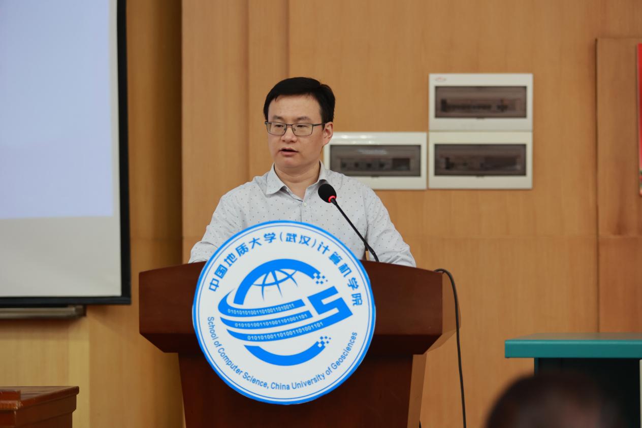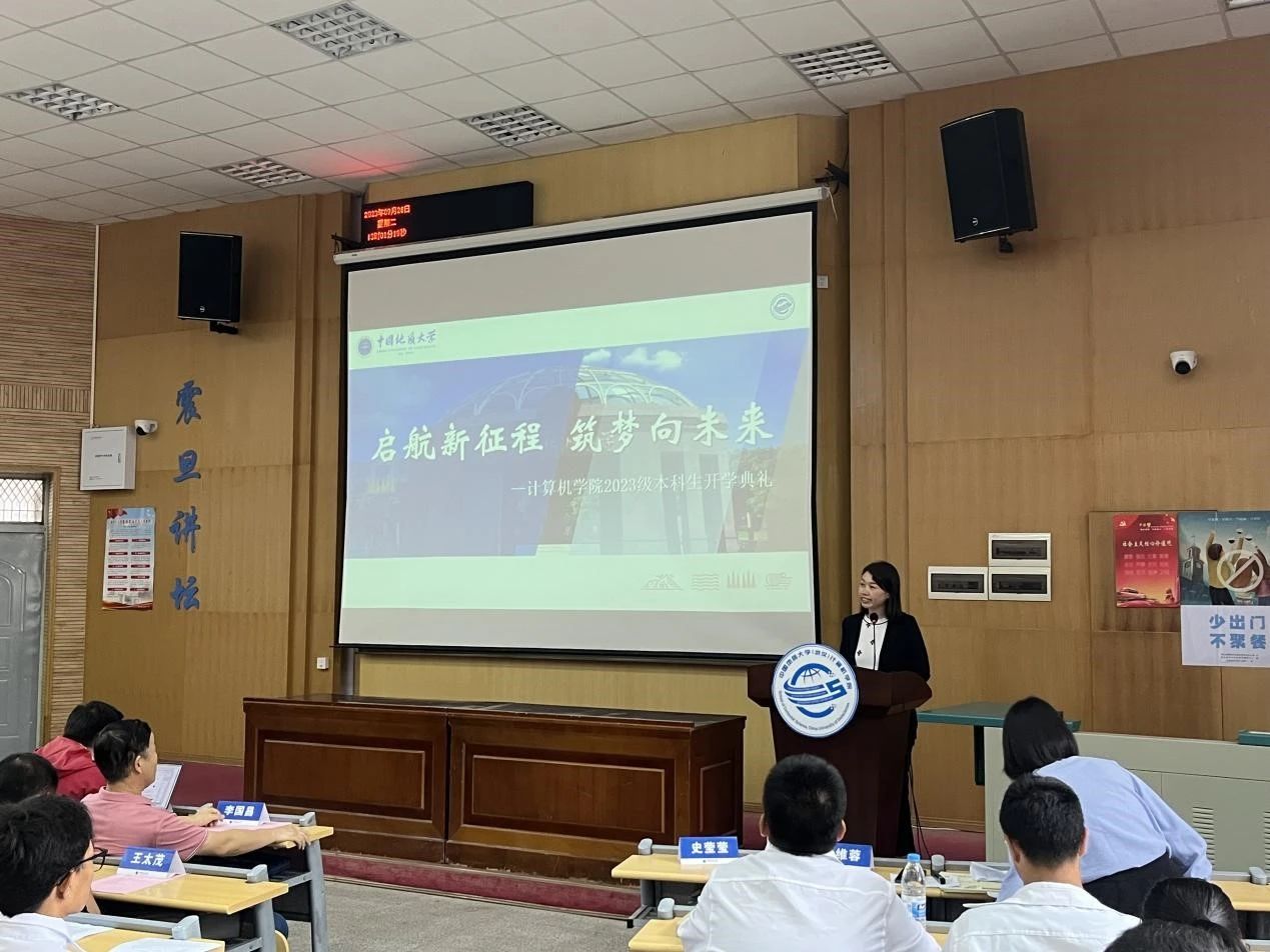 计算机学院党委副书记、院长张洪艳致辞。张院长首先代表全院师生对加入计算机学院的382位本科新生表示热烈的欢迎与衷心的祝贺,他对同学们选择加入计算机大家庭,成为“地大计科人”感到分外欣慰。他希望同学们在未来几年中为自己的选择砥砺耕耘、拔节生长、向阳而生,在地大、在计算机学院留下一生中最为深刻的年轮。同时,他向全体新生提出三点建议:一是要选择肩负使命,心怀国之大者。计科学子要深耕科研土壤,为国家掌握关键性核心技术贡献力量,让青春在实现民族使命中闪耀;二是要选择仰望天空,永攀知识高峰。计科学子要保持对知识的渴望,努力成长为具备计算思维、引领行业发展的交叉学科人才,用广阔的学科视野面对新的挑战;三是选择脚踏实地,练就过硬本领。计科学子要时刻与电脑和网络打交道,在电脑与网络间要学会拒绝诱惑,将时间用在了解行业发展最新前沿,了解市场需求驱动关键技术的突破。