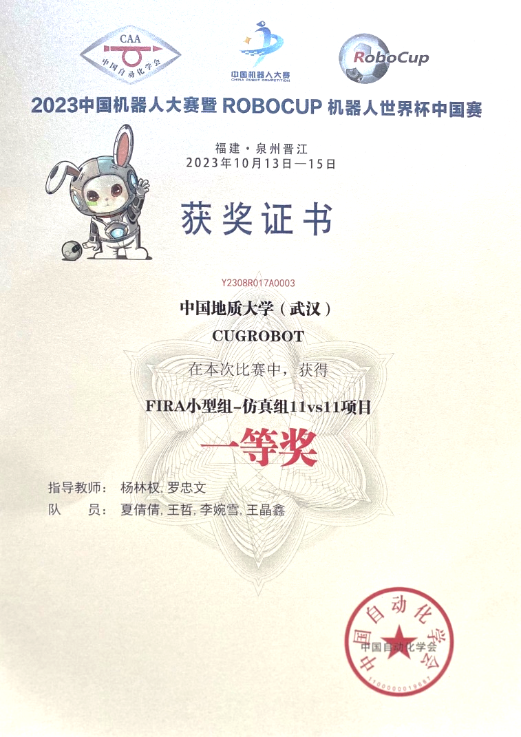 由张翡、朱子恒和曾馨等学生组成的FIRA仿真组5vs5项目代表队和由夏倩倩、王哲、李婉雪和王晶鑫等学生组成的FIRA仿真组11vs11项目代表队,从单个机器人的运动控制到物理模型预测,再到多个机器人的路径规划和整个机器人队伍的阵型协同优化,机器人代表队在指导老师的带领下日夜奋战,不断攻克难题,不断进步。经过小组循环赛、淘汰赛和最后的决赛,他们凭借高超的技战术水平和稳定的表现取得了两个季军和两个一等奖的优异成绩。