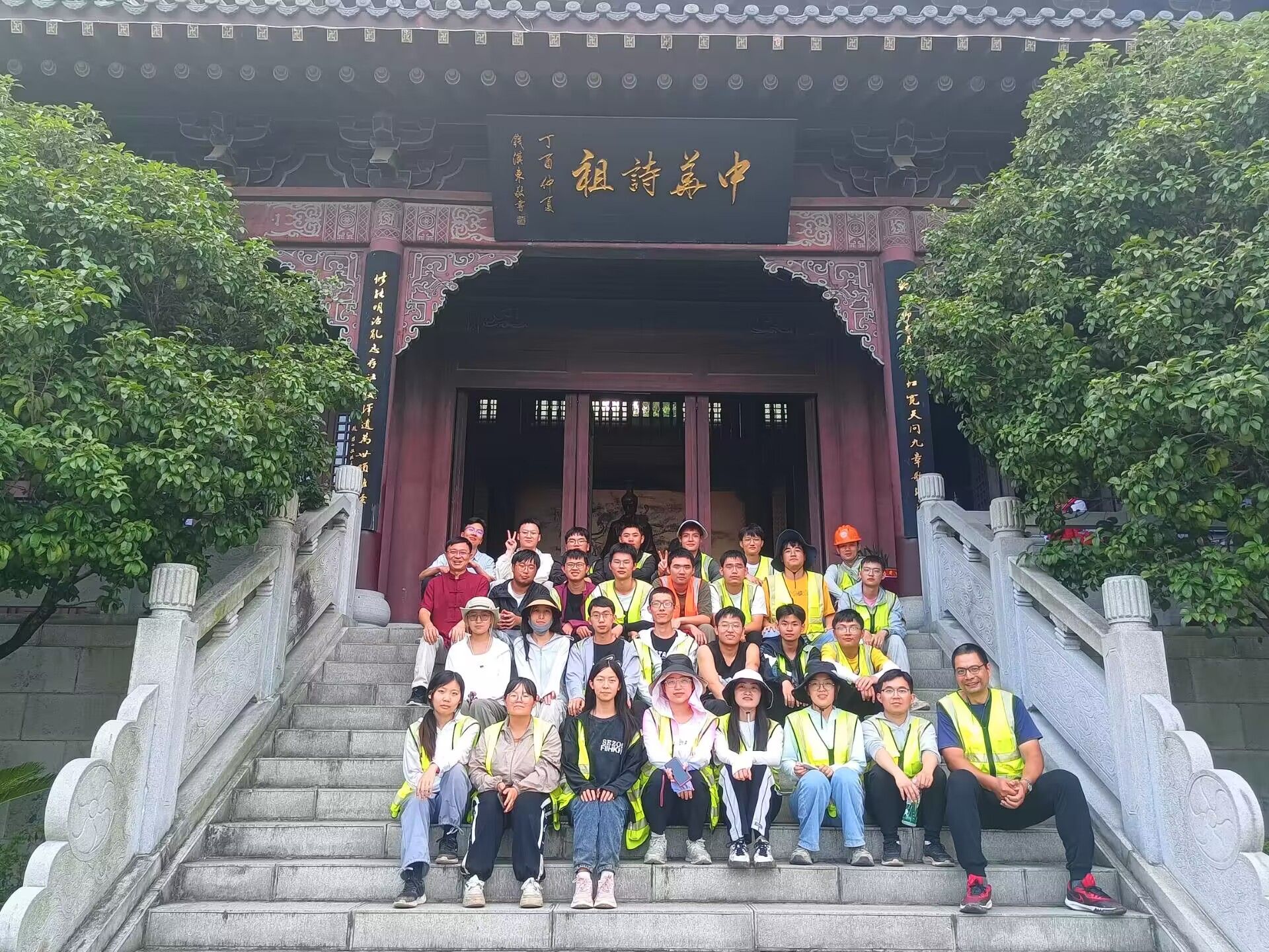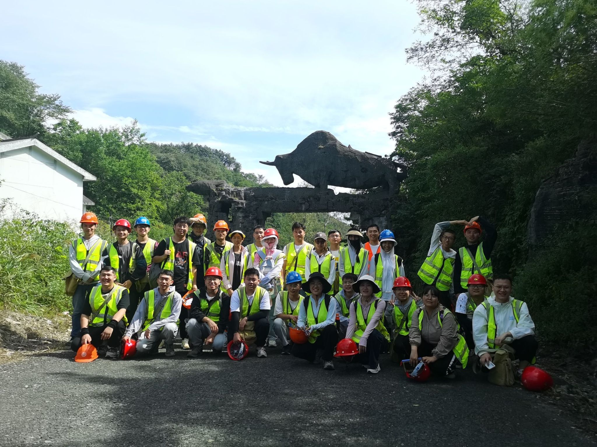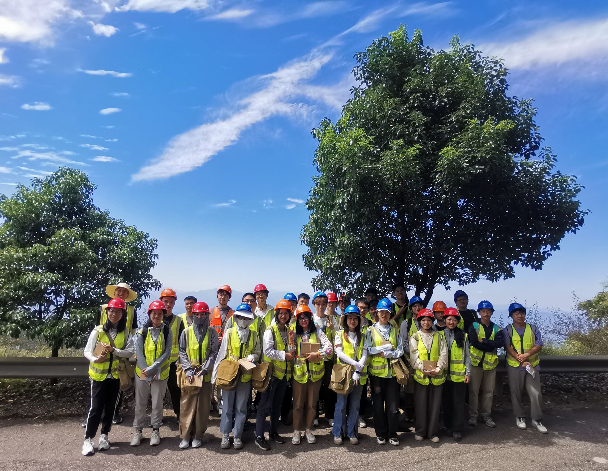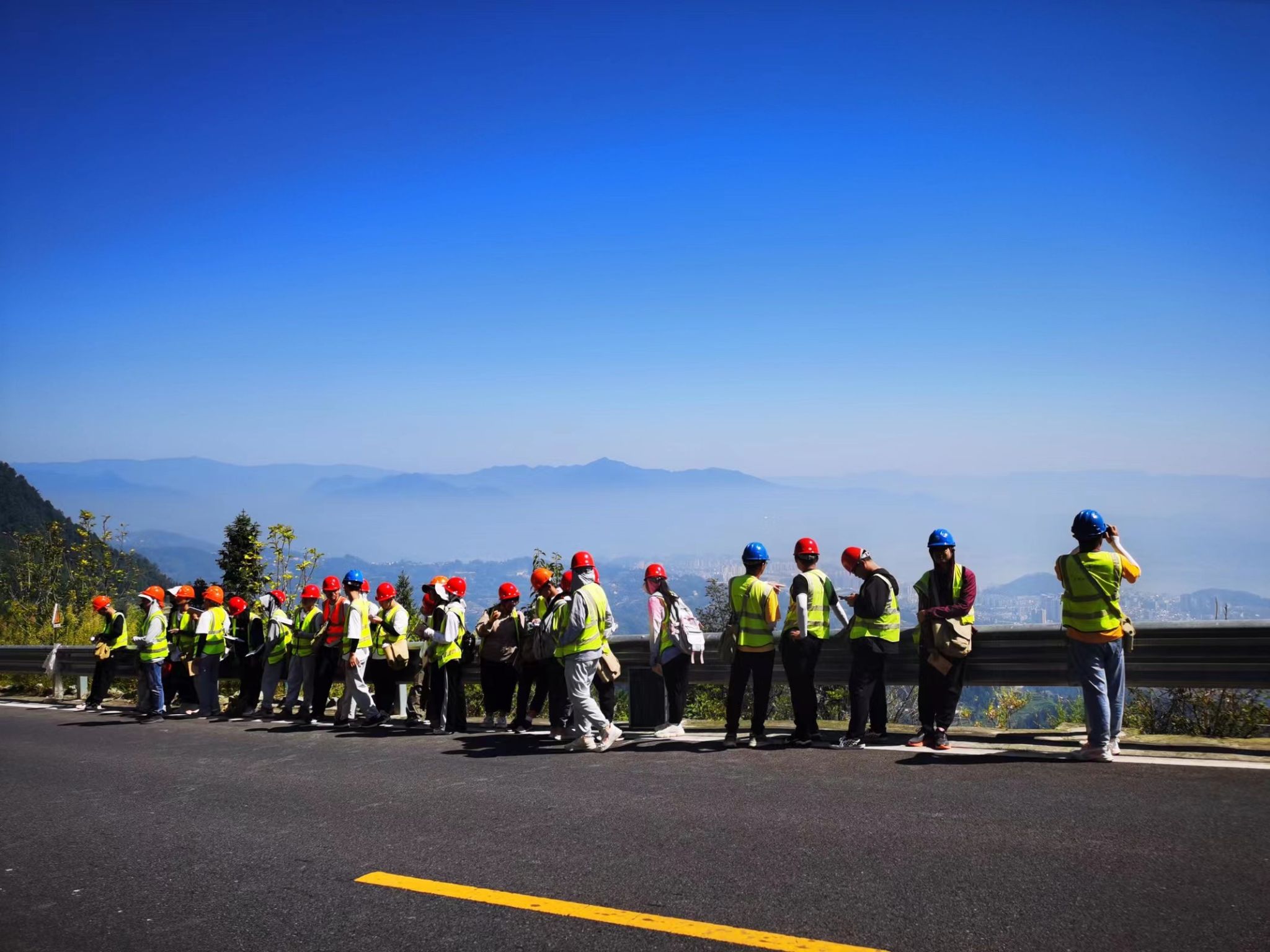 在蓝天白云、绿水绕山的美景下,全体师生在观景台上合影留念。除了实习实践教学活动之外,临时党支部组织开展了丰富多彩的活动,将思想政治教育和实习实践教学融会贯通。