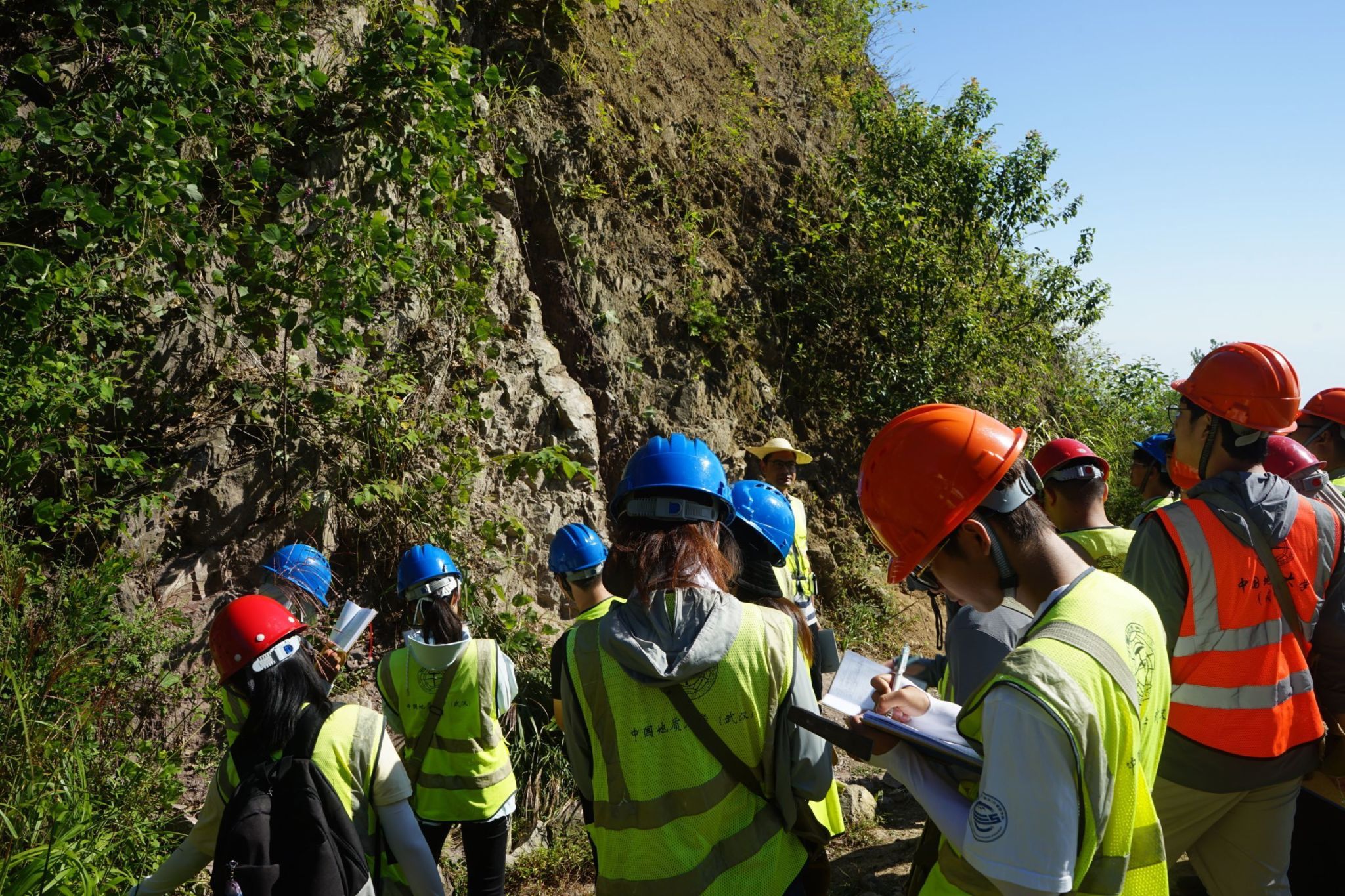 观察、讨论、描述、记录、收集、拍照,同学们拿上地质三大件,运用传统的野外地质研究方法,动眼、动口、动手,用放大镜观察岩石、用罗盘测量产状,集思广益、将今论古。