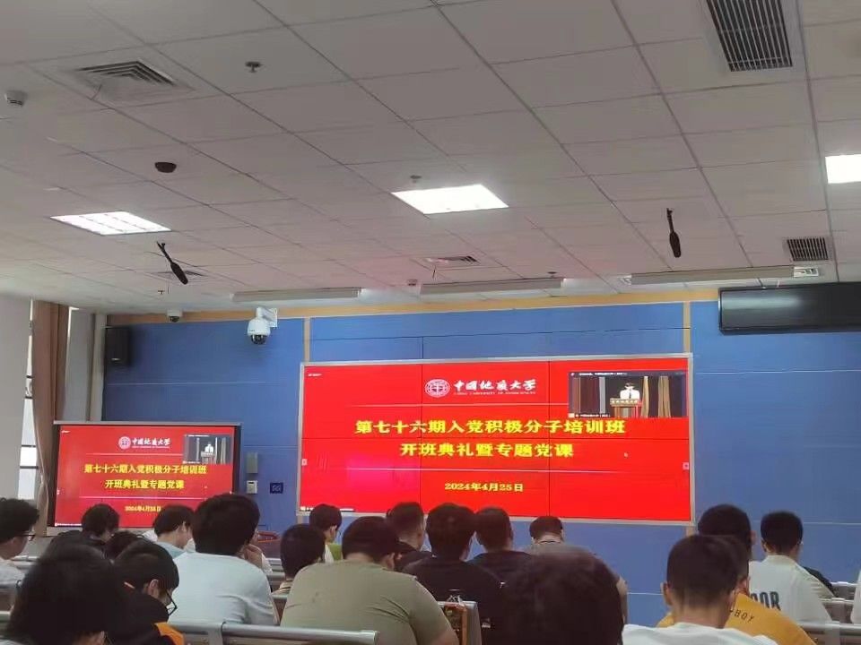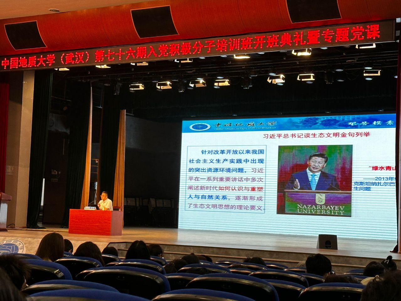 2024年4月25号下午,中国地质大学(武汉)第76期积极分子培训班开班典礼暨专题党课顺利召开。本次党课在南望山和未来城校区同时开展,计算机学院132名学员参加本次开班典礼暨“习近平生态文明思想的形成逻辑、理论蕴含与实践要求”专题党课。本次党课由中国地质大学(武汉)马克思主义学院副院长、博士生导师,陈军教授主讲。