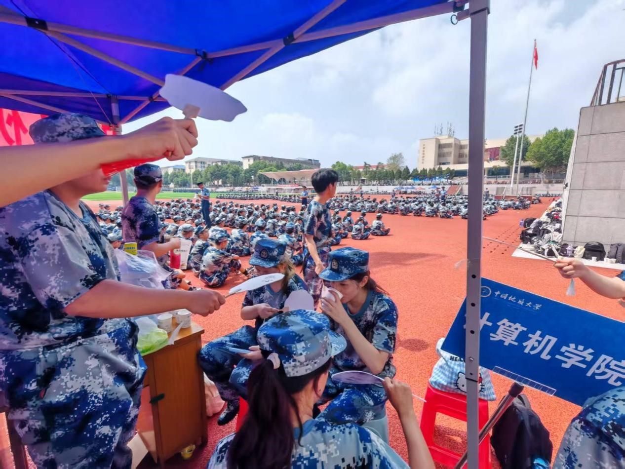 特别令人感动的是,虽然只是预热训练,但计算机学院组建的“代码先锋”军训服务队全程待命。他们穿梭在训练场间,精准调度物资、协助医护保障,就像运行一套精密的操作系统,用实际行动诠释着计科人“严谨务实、团结互助”的专业精神。