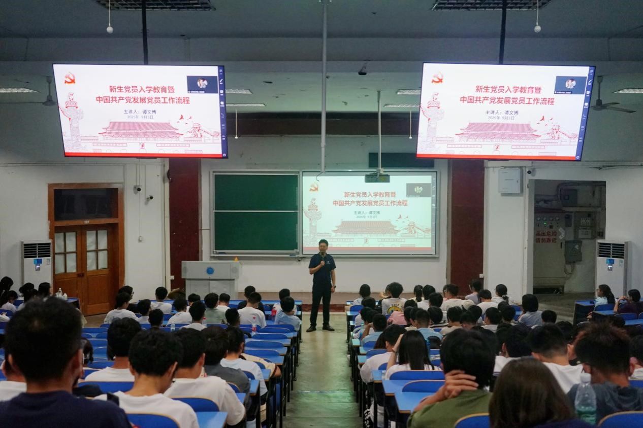 辅导员谭文博围绕“认识中国共产党、发展党员工作流程、学院党建办公室职能”三大核心展开入党教育。他介绍从“申请入党”到“党员转正”的五步发展流程,明确入党相关细节;同时介绍学院党建办公室架构,分享历届党建办成员成长案例,为新生明晰发展方向。