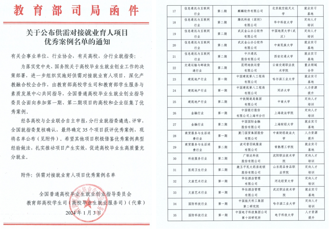 2023年12月28日,教育部第三期供需对接就业育人项目交流推进会在四川成都电子科技大学举行,来自全国的400余所高校和150余家企业参与。交流推进会现场公布了第一、二期供需对接就业育人项目优秀案例名单,评选出优秀案例共计35个。