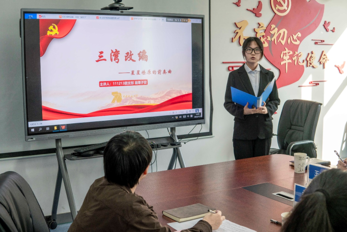 1194192团支部书记毕妍君以“十一届三中全会”为主题,介绍了十一届三中全会的重要性成果。