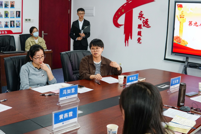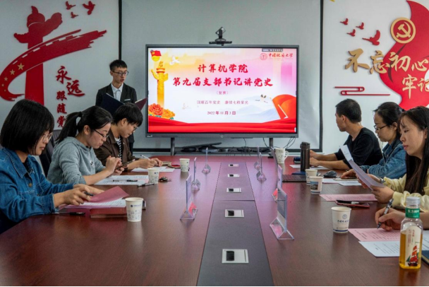 2022年11月3日下午,计算机学院第九届“支部书记讲党史”学生团支部书记组比赛在学院309会议室举行。院直党支部书记黄燕霞,人工智能系党支部组织委员冯如意,软工党支部书记叶亚琴,团委书记李欢欢,学生党建办公室主任王太茂,心理健康指导老师闫维蓉,院学生会指导老师李祥瑞现场观摩。党建办公室组织部副部长靳博原主持活动。