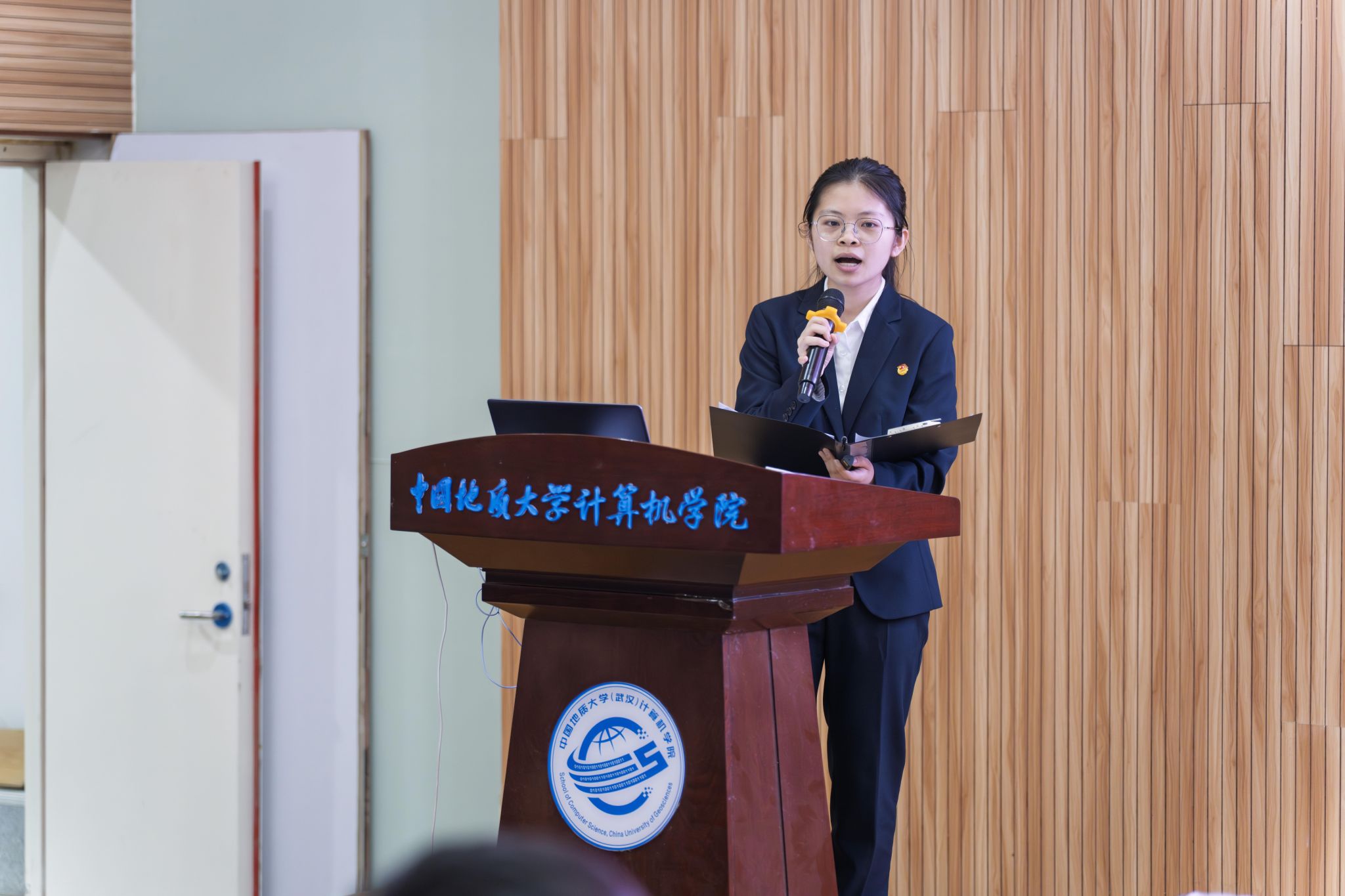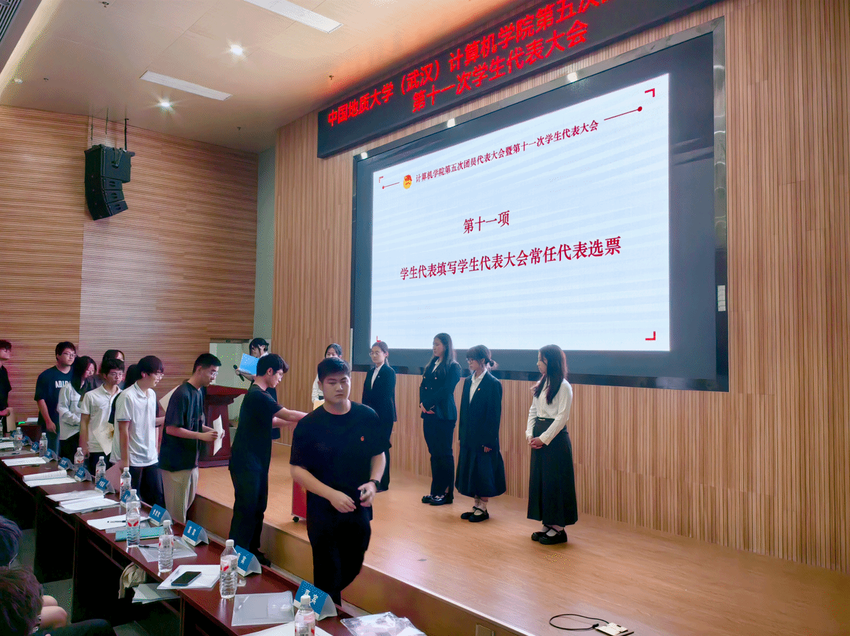 接着,计算机学院2024届团委副书记叶辰勋宣读大会代表资格审查报告以及团委副书记、学生会主席团候选人资格审查报告;计算机学院2024届团委副书记段子龙宣读中国地质大学(武汉)计算机学院第十一次学生代表大会选举办法。