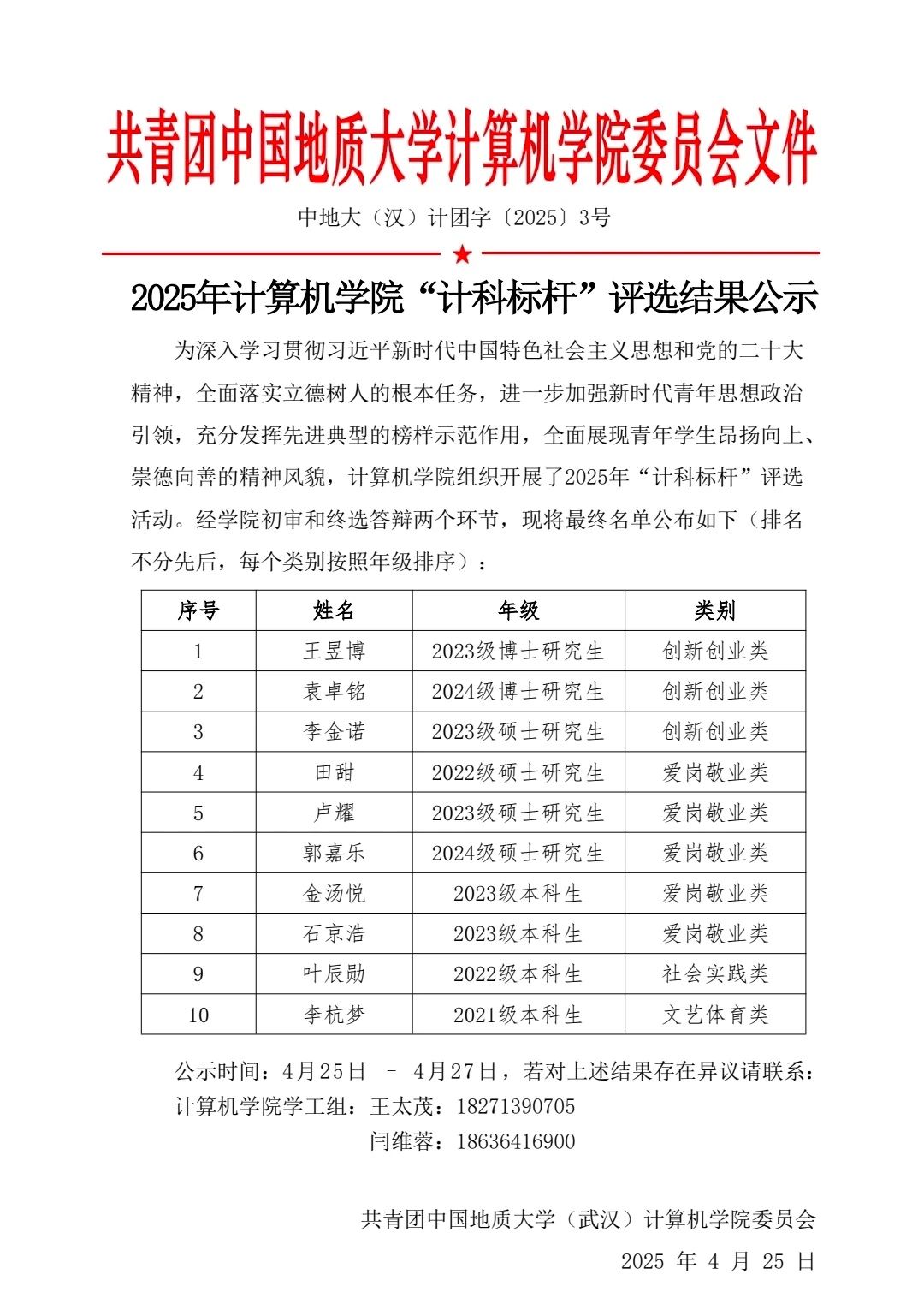 2025年计算机学院“计科标杆”评选结果公示