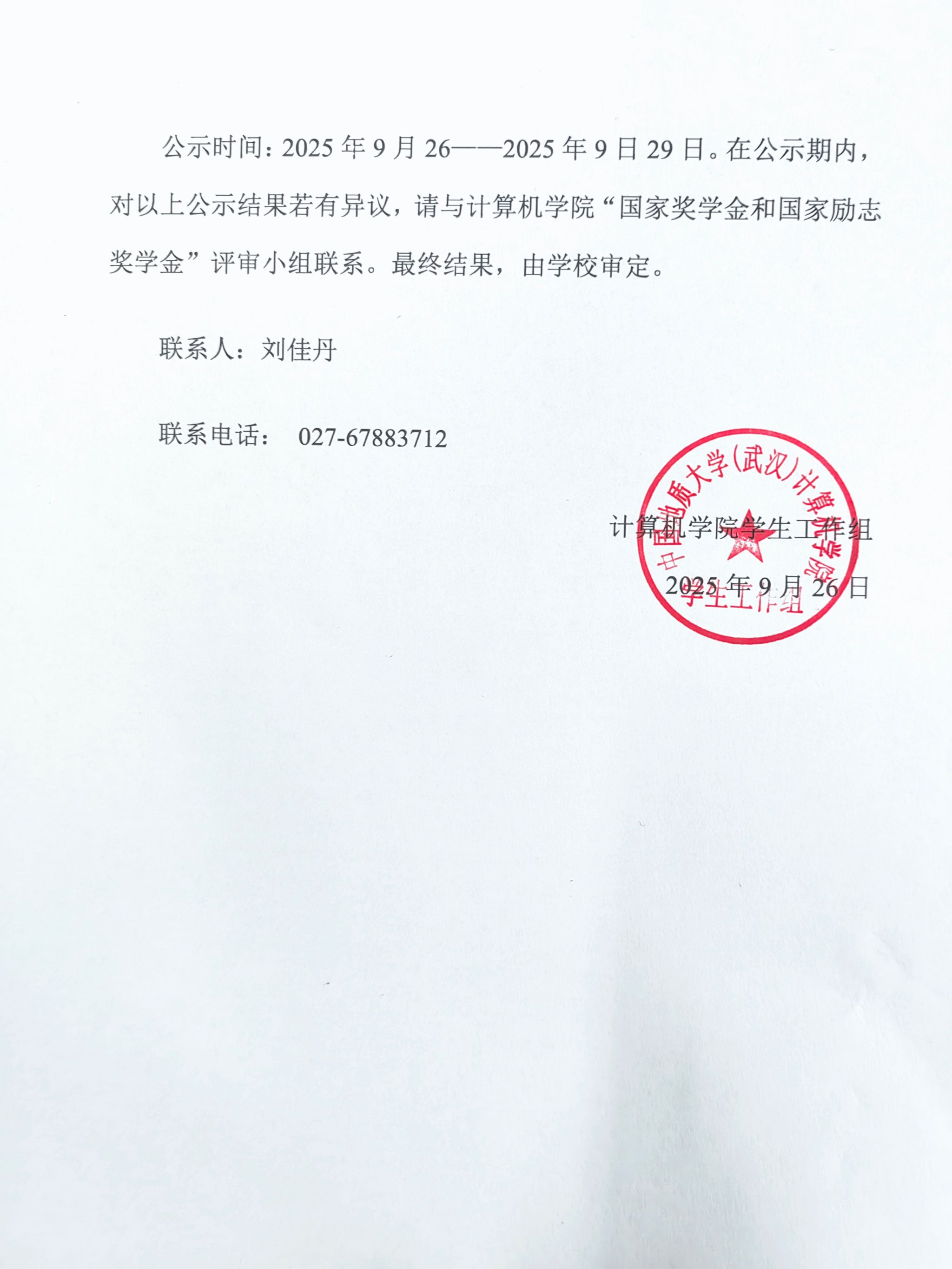 计算机学院关于公布2024-2025学年国家奖学金、国家励志奖学金拟推荐人选的公示