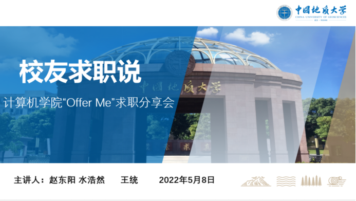 (通讯员:顾伟超)计算机学院“Offer Me”分享会之“校友求职说”专场活动于5月8日成功举行。本次活动邀请到3位来自不同行业的校友:2021届计算机科学与技术硕士专业毕业生赵东阳,目前就职于中国建设银行湖北分行;2020届计算机技术硕士专业毕业生水浩然,目前就职于中国航天科工集团第二研究院706所;2021届计算机科学与技术硕士专业毕业生王统,目前就职于成都市公安局,在线分享他们的职业选择、求职规划与工作感受。学院团委书记、研究生辅导员李欢欢,2019级辅导员闫维蓉以及200余名学生参与此次分享活动,李欢欢担任主持。