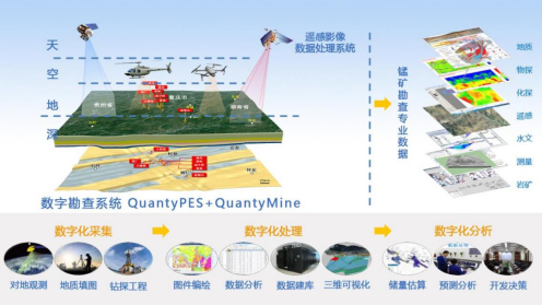 实现地质勘查行业数字化转型,需要在地质信息科学理论和方法论框架下,运用系统化的地质信息技术,建立完善的数据资源体系,使数据流转顺畅、充分共享,进而打通勘查、设计、开采、选冶、管理等各个环节,为实现探采一体化和智能化奠定基础。以吴冲龙教授为学术带头人的地质信息科学与技术团队在长期地质信息科学理论方法和地质信息技术研究的基础上,基于自主知识产权的三维可视化地质信息系统软件平台QuantyView研发了数字勘查和数字矿山系统,致力于服务新时期地质勘查行业数字化转型和数字经济的发展。