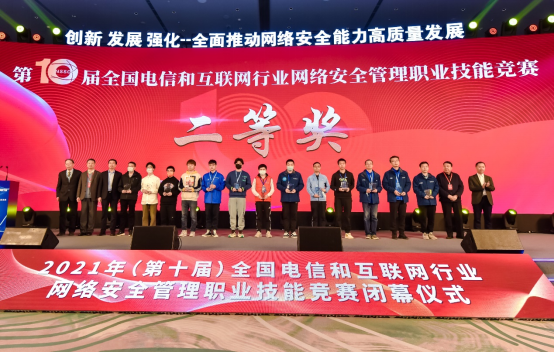 竞赛闭幕仪式暨颁奖礼在“2021年(第十一届)电信和互联网行业网络安全年会”主论坛上举行。工业和信息化部网络安全管理局局长隋静、湖北省通信管理局局长吴俊、中国国防邮电工会全国委员会副主席黄敬平、中国信通院副院长魏亮、中国通信企业协会副秘书长赵俊湦出席闭幕仪式并致辞。来自全国31个省、自治区、直辖市通信管理局、省通信行业协会、基础电信运营企业、互联网企业、网络安全企业和科研机构、高等高职院校等相关单位的领导和代表以及参赛选手近400人参加闭幕式。
