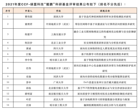(通讯员:孙彦钦)近日,CCF-绿盟科技“鲲鹏”科研基金项目组根据课题申请方向,邀请了相关领域的专家,对课题的创新性、科学性、目标合理性等方面进行了综合性的评审,最终评选出14个项目获得“2021年度CCF-绿盟科技鲲鹏科研基金”资助,其中,中国地质大学(武汉)计算机学院任伟教授、董理君教授课题组喜获两项资助!