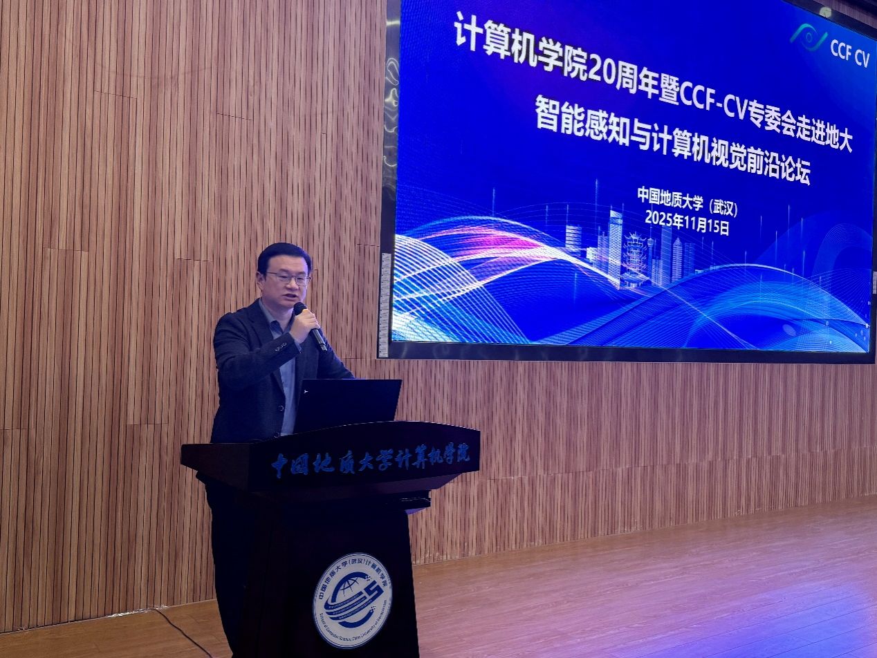 2025年11月15日,中国地质大学(武汉)计算机学院迎来建院20周年,由中国计算机学会计算机视觉专委会(CCF-CV)主办、计算机学院承办的第148期“CCF-CV走进高校”系列报告会——“智能感知与计算机视觉前沿论坛”在中国地质大学(武汉)未来城校区计算机学院126报告厅成功举办。本次活动作为中国地质大学(武汉)计算机学院建院20周年暨计算机学科建设40周年系列学术活动的首场报告会,吸引了来自武汉大学、华中农业大学、华中师范大学、地大等多所兄弟高校的200多名师生踊跃参加,共同见证学院在人工智能与计算机视觉领域的发展成果与学术影响力,标志着院庆系列学术交流活动的正式启幕。中国地质大学(武汉)计算机学院院庆系列学术活动由院长张洪艳教授担任总执行主席,智能系刘袁缘教授担任本次报告会的执行主席,蒋良孝教授、黄绍广教授、孙琨副教授等智能系教师担任此次报告会执行委员。