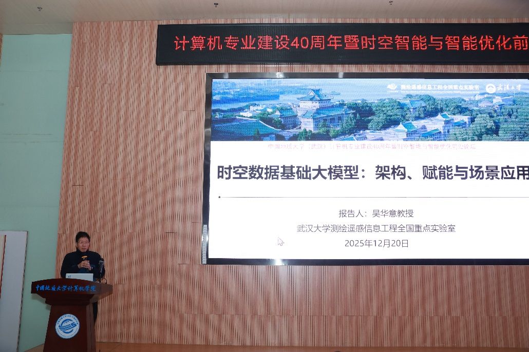 2025年12月20日,值此中国地质大学(武汉)计算机学院建院20周年之际,由计算机科学与技术系与计算机应用系组织的报告会——“时空智能与智能优化前沿论坛”在中国地质大学(武汉)未来城校区计算机学院126报告厅成功举办。本次活动作为中国地质大学(武汉)计算机学院建院20周年暨专业建设40周年系列学术活动之五,吸引了来自武汉大学、华中科技大学、中南大学、北京师范大学、安徽大学、武汉科技大学、江苏理工学院等单位国内外知名学者踊跃参加,共同围绕时空智能与智能优化“理论—技术—应用”前沿展开深入交流,集中展示人工智能时代时空信息处理与智能优化算法的新突破、新范式,为院庆系列学术活动再添浓墨重彩的一笔。计算机学院党委书记李红丽、院长张洪艳教授出席,报告会由张洪艳教授、刘刚教授、陈麒玉教授、卢超副教授依次主持,熊慕舟副教授作总结发言。